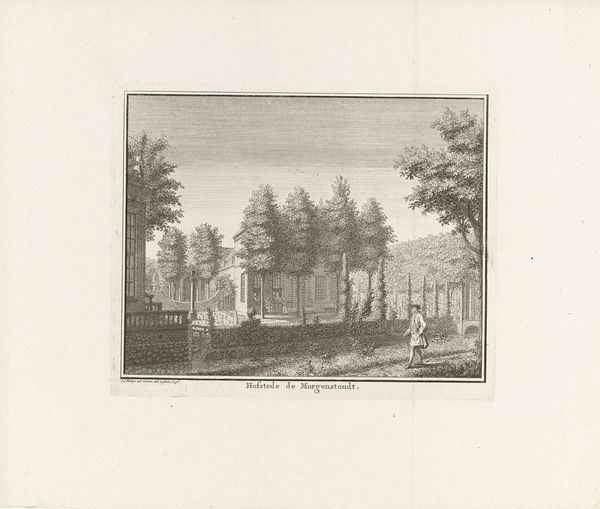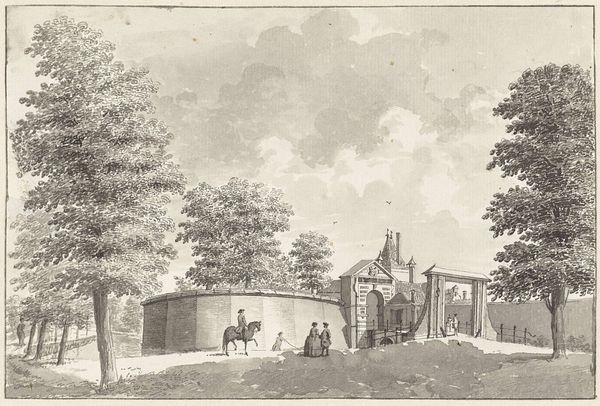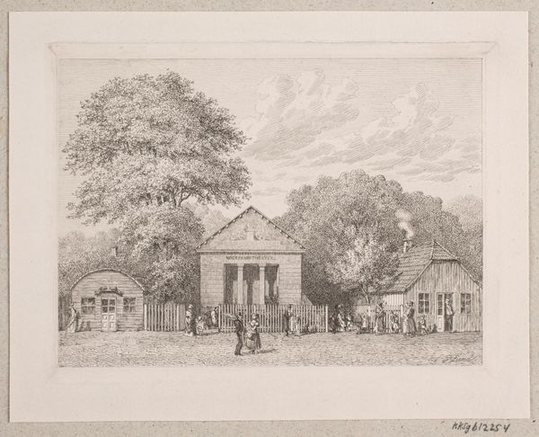 Edouard Taurel's print, 'Ingang van Artis, Amsterdam', captures the entrance to the Artis zoo, using delicate lines to depict a scene of leisurely activity. Notice how the composition is structured around a central gate, flanked by symmetrical guardhouses, drawing the eye into the zoo's depth. The use of hatching and stippling creates subtle tonal variations, suggesting light and shadow, and adds a tactile dimension to the architecture and foliage. The figures, rendered with careful detail, populate the space and provide a sense of scale, grounding the architecture in human experience. The print engages with ideas of public space and leisure, reflecting the 19th-century interest in making nature accessible to urban populations. The detailed rendering of the scene serves as both a record of a specific place and a representation of broader cultural values associated with nature, recreation, and social order.