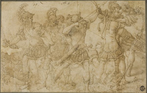Curator: This drawing is "Madonna and Saints," attributed to Andrea Boscoli around 1597, and it resides here in the Städel Museum collection. It's executed in pen, ink, and red chalk. Editor: Immediately, I’m struck by how dynamic the composition is, all these figures swirling upwards towards the Madonna. It almost feels… theatrical? Curator: That theatricality reflects the influence of the Counter-Reformation on art. The Church sought to engage the faithful, and artwork like this emphasized dramatic narratives and emotional connection. Consider the poses – the figures below gazing up, the angels caught in mid-flight. It’s all designed to elevate the viewer’s experience. Editor: Absolutely, there’s a clear hierarchy. Madonna is literally elevated. I’m curious about the figures at the bottom. Are they specific saints, or more allegorical representations of believers? It speaks to power structures within the church at that time. The placement and gestures all seem quite deliberate. Curator: We think they're saints particularly revered in the regions where Boscoli was active. It's likely he tailored his depictions to local devotional practices. It reflects how the universal message of the Church was constantly being adapted and reinterpreted at a local level. Editor: I notice the red chalk medium also brings a warmth, softening what could have been a stark scene. How did that material choice affect the distribution of his pieces? Were pieces like these circulated beyond the inner circles of patrons? It begs questions about class dynamics, the material implications of religious faith at the time. Curator: Drawings like this often served as preparatory studies for larger paintings or frescoes. They would circulate within the artist’s workshop or amongst other artists and patrons. It allows us to get a glimpse into his creative process, which can inform so much of what religious experience looked like at the time. Editor: Knowing it's a preparatory drawing does shift my perspective; there's something vulnerable about it. The layers and visible line work suggest a seeking of something, of deeper meanings. And maybe, also a seeking to affirm the place and meaning of the individual, within systems of both power and belief. Curator: It's a beautiful paradox, isn't it? A deeply structured piece with so much freedom to discover something personal through an age defined by religious institution. Editor: It makes me appreciate this even more! Thanks for that insight.