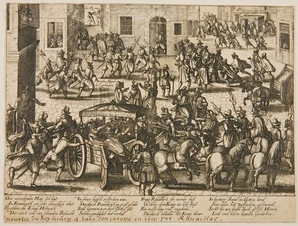 Editor: Here we have "Lijkstatie van George I, koning van Engeland, 1727", or "The Funeral Procession of George I, King of England, 1727," an engraving by Leonard Schenk dating from 1727 to 1729. It’s a very busy scene; my eye struggles to find a focus amid all the figures. What stands out to you? Curator: Note the emphasis on linear perspective, a structural device controlling our gaze, leading us through the crowd toward the architecture in the background. The foreground figures are etched with more detail, naturally diminishing in clarity as depth increases, reinforcing this perspectival recession. Editor: That makes sense. So the converging lines draw us into the depths of the image. Are you suggesting this technique is central to the work’s impact? Curator: Precisely. Consider how the artist employs hatching and cross-hatching to create tonal variations. See the darker areas in the foreground contrasting sharply with the lighter buildings. This modulation of light and shadow creates visual texture and depth, emphasizing the Baroque aesthetic through dramatic contrasts. It also directs the eye towards specific areas within the composition. Where does your eye go first and why? Editor: The funeral carriage in the center, because of the details and maybe because it is the…purpose? Is it too simple as an observation? Curator: Not at all! The interplay of light and shadow renders that area significant. Consider also, how the structural elements guide our interpretation. Editor: It’s fascinating how focusing on the artistic choices gives you a new appreciation. Curator: Indeed. Analyzing these formal elements—line, perspective, light—unlocks layers of meaning that might otherwise remain unseen.