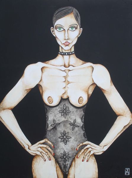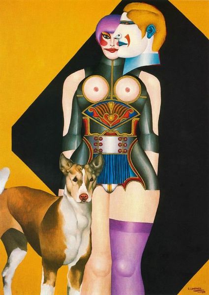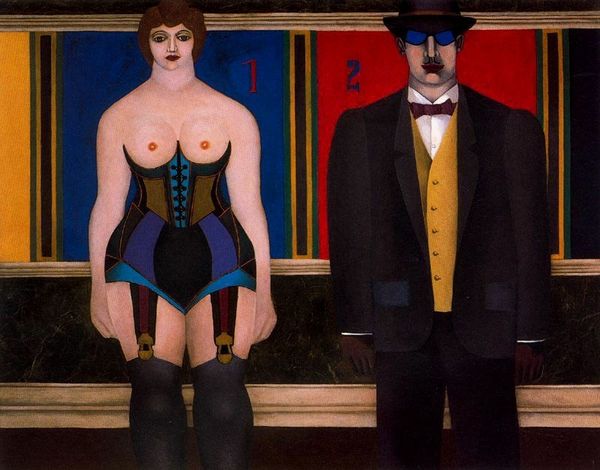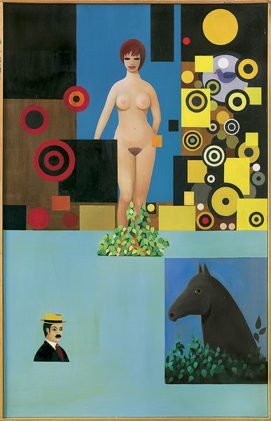 Editor: Here we have Kazimierz Mikulski’s “PRÓBA W LUNAPARKU,” painted in 1967. It looks to be acrylic on canvas. It's… rather striking. The colors are bold, and the composition is, let’s say, unconventional. What do you see in this piece? Curator: Formally, the composition is structured as a series of discrete planes and blocks. The juxtaposition of figuration against abstraction is notable, especially given the rather crude representation of the female form. The painting is very much interested in surface, as we might expect with acrylic application, each plane with its own texture, seemingly discontinuous with its neighbors. Editor: Discontinuous, yes, exactly! It feels… fragmented. Like it’s assembled from different pieces that don’t quite fit. Is that intentional, do you think? Curator: The intent is not ours to decide, however the disjunction could be a point of departure. How do you view the palette at work here? The artist offers very flat colours, a blue background contrasting against deep browns, and then red in the juggling balls as well as stripes within the suggestive corset. This division and the deployment of the colour must be closely observed to consider the totality of the work. Editor: I suppose the lack of depth flattens the imagery as well? And, although seemingly incongruous, these details create a strangely balanced work of art. Curator: I agree. Note, however, that it may only be by pushing these formal contrasts to extremes that it comes off as, as you say, balanced. What might be considered beautiful in traditional painting is almost turned on its head here. Editor: It certainly challenges the conventional. This examination, in particular, helped me perceive a different, even appealing, dimension within it. Curator: Yes, careful attention to the picture plane and the formalist dimensions will always reveal additional aesthetic detail.