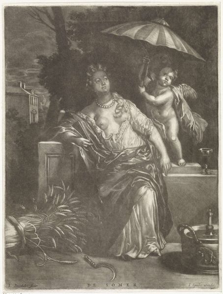Curator: My eye is immediately drawn to the intense detail achieved through the engraving. What's your first impression of this print, titled Astronomie, dating from the late 16th or early 17th century and held at the Rijksmuseum? Editor: I’m struck by the sort of assertive gaze of the central figure; there is a strange mix of vulnerability and confidence, and all rendered on paper. It has to be very deliberate, the whole look. Curator: Indeed. Cornelis Drebbel, the artist, was deeply engaged with optics and scientific instruments, which is relevant here. The engraving medium allowed for precisely reproduced imagery which served both artistic and scientific goals. Think about the cultural capital attached to astronomy at this time. Editor: The instruments speak volumes! We have the female figure, possibly an allegory of astronomy, along with an old scholar. The very act of producing this image becomes a participation in astronomical discourse; engraving the constellations is both art and documentation. Curator: Absolutely. Drebbel clearly situates himself within that evolving world of scientific representation, making astronomy itself into an object of knowledge that can be replicated and disseminated through printmaking. But I also consider the workshop context; what labor division did it require to pull something like this off? Editor: Considering the history of museums and their role in shaping our understanding of art, how did the Rijksmuseum acquire and present this engraving? These institutions play a critical role in assigning value and meaning. This engraving has entered into the history of art institutions to become a reference image of both early-modern print production, and astronomy. Curator: Agreed; there's a constant negotiation of worth through material means. By placing it in their collection and preserving the print, the museum elevates its importance in the public eye. And also consider the effect of a large institution stamping an imprimatur on a particular narrative of what and who makes art. Editor: It truly emphasizes the print's legacy and its enduring influence on artistic practices. A compelling piece! Curator: Definitely food for thought, considering the ongoing impact of art institutions on our perception of historical production.