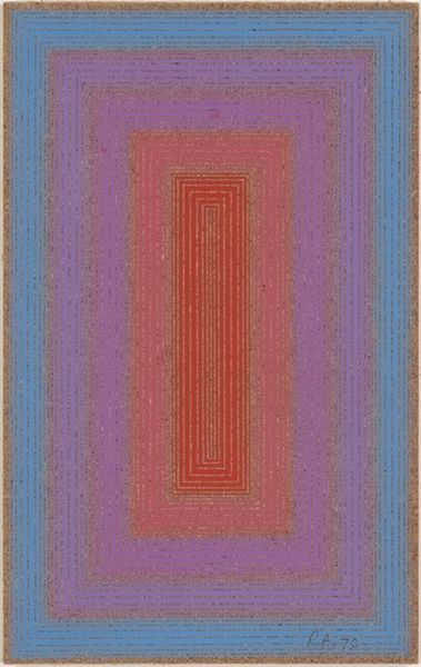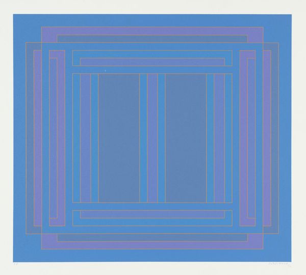 Editor: Here we have Richard Anuszkiewicz’s "Untitled (Annual Edition)," a print from 1973. The bright pinks and oranges in those geometric patterns are just so vibrant against that pale blue backdrop. It’s almost dizzying to look at, and it’s definitely grabbing my attention! What do you make of it? Curator: I'm interested in the materials. It's a print, which inherently speaks to mass production and accessibility. Think about how that contrasts with the idea of unique, handcrafted artworks typically valorized in the art world. Why choose printmaking to explore color theory and optical illusions? It's deliberately pushing against boundaries, forcing us to reconsider our notions of artistic labor and consumption. Editor: That’s a really interesting point. I guess I hadn't really considered why it was a print and what that signifies, it’s almost rebellious in a way, isn't it? Almost like bringing art to the masses through, well, mass production. Curator: Precisely. And look closely at the texture of the paper. Is it a smooth, high-quality surface, or something more utilitarian? Even the choice of paper contributes to the overall message about value and accessibility. Anuszkiewicz’s background as a colour-field painter also emphasizes how the physical act of printing allows for different effects of layering the hues together, to emphasize and explore how colour works materially. Editor: So, you're saying the medium itself is part of the message, about who art is for, how it's made, and how it circulates. Curator: Exactly! It's about grounding the ethereal experience of color and perception in the concrete reality of production and distribution. Editor: I hadn't thought of it that way at all! Now I'm looking at it completely differently. Thanks! Curator: And I appreciate your initial observation about its vibrancy - a reminder that material analysis shouldn't overshadow the sensory impact of the work.