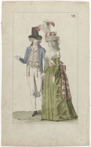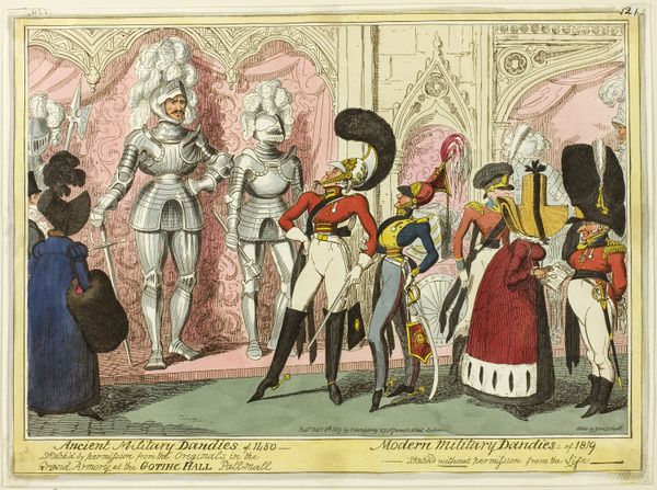 Editor: This lithograph and etching by J.J. Grandville, made in 1829, is called “Sir, I offer you my respects and my daughter” from Metamorphoses of the Day, now at the Met. It depicts figures with animal heads in formal wear. The scene feels satirical to me, almost like a commentary on arranged marriages, but the animal heads add a bizarre twist. What do you see in this piece? Curator: I see a powerful commentary on social structures of 19th-century France. Grandville frequently used anthropomorphic figures – animals with human characteristics – to critique the bourgeoisie and aristocracy. The animal heads, rather than being merely bizarre, serve to dehumanize the subjects, exposing what he sees as their base, animalistic drives related to wealth and status. Editor: So, the animal heads aren't random? Curator: Not at all. The choice of specific animals is often symbolic. We see this wealthy fish figure offering his daughter to, what seems to be, a man with the head of an owl. Consider the period after the French Revolution. The aristocracy was attempting to hold onto power in the face of rising social and economic changes. This is potentially why Grandville critiqued these figures. How do you see this work connecting to Romanticism? Editor: I guess I assumed the animal heads indicated Romanticism. I figured that linked back to its focus on emotion and imagination, rejecting rational thought. Curator: It’s true Romanticism emphasized those things. The social critique, though, situates this in its specific historical moment. Do you think the location of this piece within a major institution changes your view on the artist's social critique? Editor: I never thought of that. It’s like the artwork has been somewhat absorbed into the thing it’s mocking, I guess? Curator: Precisely. And that tension between art, social commentary, and institutional validation is part of what makes art history so fascinating. Editor: Absolutely! It gives me a lot to think about. Thanks for your insight into this print.