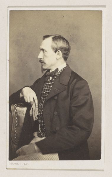 Editor: This is "Portrait of the painter Godfried Egide Guffens" by Joseph Dupont, an albumen print from 1861. There's a stillness, almost a somberness, to this image. What stands out to you? Curator: The sitter's averted gaze immediately catches my attention. What does it mean to avoid the viewer's eyes, even in a portrait? In this context, it speaks to Romantic ideals of interiority and perhaps a self-awareness verging on melancholy. Consider the era: photography was relatively new. Each portrait was almost an act of preservation of that person and of the values of their time, and their vision for their time, with each selected element. Editor: That's fascinating! How does knowing he was a painter himself affect our interpretation? Curator: It complicates it, doesn't it? Is this how Guffens, as a painter, wished to be seen? Is he presenting himself as the embodiment of the artistic temperament, brooding and introspective? The averted gaze now also embodies someone observing more than being observed, turning it back on us as viewers, since as a painter he makes those decisions every day, for every subject he engages with. Editor: So, the image becomes a statement not just about *him*, but about the artist's role in society at that time. Curator: Precisely! The symbols are subtle - his formal attire suggesting status, yet the overall tonality leans towards muted and earthy. It's as if Dupont captured not just a likeness but a mood, a specific cultural moment of introspection amid progress. Editor: I never thought about how the gaze itself could be such a loaded symbol. This has given me a lot to consider! Curator: Indeed. Art helps us reflect upon the nuances of history through visual cues and deeply human expressions, like here, that says so much with no sound at all.