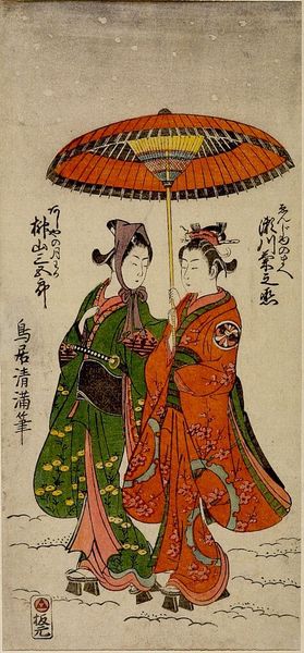 Editor: This is Kitagawa Utamaro's "Fun'ya no Yasuhide, from the series The Six Poets Represented by Modern Children," a late Edo period print. The figures seem almost suspended against the neutral background. What do you make of the composition? Curator: The spatial arrangement invites careful consideration. Note the deliberate layering of figures and how each plane interacts. The delicate lines and subtle color variations serve to unify the composition, creating a sophisticated visual harmony. Editor: I see. So, the relationships between the lines and colors are key? Curator: Precisely. The artwork’s power resides not just in its subject, but in the formal relationships established through line, color, and form. Editor: That really makes me look at the piece differently. Thanks! Curator: My pleasure. Reflecting on the composition enriches our viewing experience.