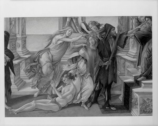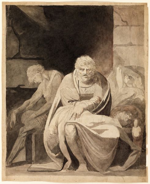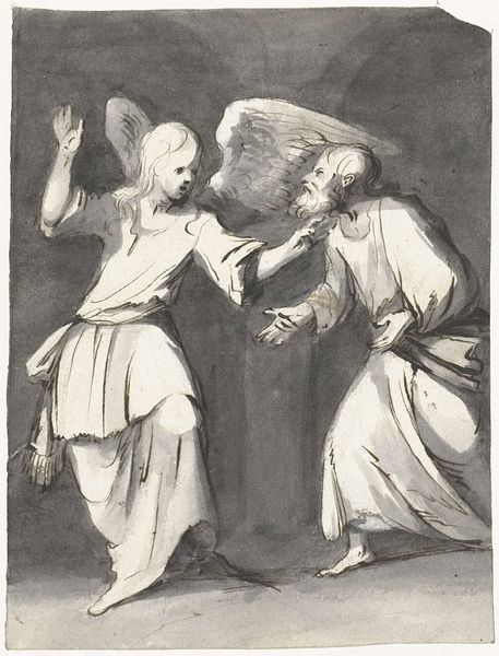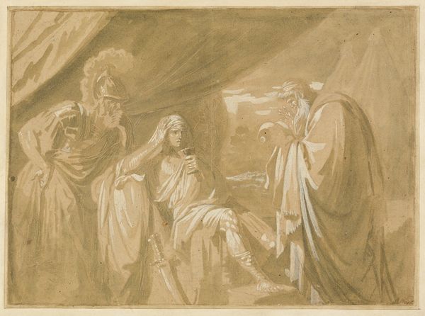 Curator: Here we have "Sokrates," an engraving created in 1786 by J.F. Clemens, residing in the collection of the Statens Museum for Kunst. Editor: It feels instantly melancholic. The somber tones and the pensive pose create this immediate air of introspection and perhaps even resignation. Curator: Engravings like this were crucial in disseminating Neoclassical ideas and imagery. Look closely at the precise lines, how the figure of Socrates is rendered with almost sculptural clarity, characteristic of the era's interest in classical antiquity and its philosophies. Consider, too, the labor that goes into the craft; each line etched into the plate by hand. Editor: I’m drawn to the figures hovering behind him, so ephemeral and suggestive. The ghostly couple locked in embrace really underscores themes of mortality and maybe even the pursuit of higher ideals. Could these be representations of love, longing, or even philosophical concepts? Curator: It certainly begs the question of interpretation. This image’s existence speaks volumes about the art market, designed to appeal to an educated elite who could appreciate its subject matter and skill, those consuming this product also held specific values in common regarding education and philosophy. The cost of commissioning such an engraving versus, say, a simple woodcut also delineates the audience very clearly. Editor: Beyond that context, Socrates represents a complex symbol, a martyr for truth. Even his simple garments become emblematic of a certain moral rectitude, stark against those embracing figures. Curator: Right. The paper itself, and the ink used to create this print, were produced by specific trades that contribute to an accessible understanding of history, reflecting economic realities and social values related to material culture of the time. Editor: Reflecting on "Sokrates," I’m left pondering the weight of ideas, and the persistence of these timeless symbols throughout our own histories. Curator: Absolutely. When you begin to dissect and explore the economic and social structure within which art such as Clemens’ piece here was created, an artwork expands beyond aesthetics and representation, transforming into an actual fragment of the historical record.