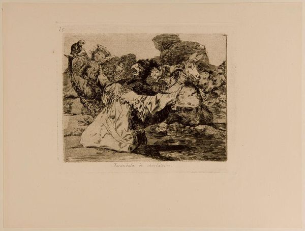 Curator: Goya's print, "Nothing. The Event Will Tell," presents an unsettling scene. It feels oppressive, the darkness punctuated by what look like disembodied faces. Editor: It’s interesting to consider the printmaking process here; the aquatint and etching techniques would have allowed Goya to create those rich tonal variations. Curator: Look at the fallen figure, seemingly crushed beneath a wooden beam and a sheet bearing some script. The beam feels symbolic, perhaps representing oppressive forces. Editor: And those faces looming in the background, they could signify a collective conscience, or perhaps the specter of judgment. Curator: The materiality of printmaking itself becomes a means of disseminating these dark visions—the etchings allowing for mass production and widespread distribution of Goya's social critique. Editor: It's a bleak picture, and even the title, "Nothing. The Event Will Tell," suggests an impending doom or revelation. Curator: Indeed, the ambiguity allows the viewer to project their own anxieties onto the scene. It’s quite a feat of artistic commentary, however grim. Editor: Agreed. Goya's dark vision, technically realized, continues to resonate across centuries.