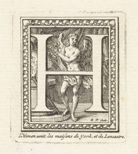 Editor: Here we have "Letter I en de huwelijksgod Hymen," or "Letter I and the God of Marriage Hymen," an engraving by Bernard Picart, dating between 1683 and 1733. I find the use of line so compelling, almost architectural in its precision. What compositional elements stand out to you? Curator: The "I" dominates the composition, doesn't it? Its stark whiteness creates a strong contrast against the intricate line work surrounding it. Notice how the artist uses the letter not just as a form, but as a structural element, dividing the scene and framing the figures of Hymen and what appears to be an allegorical figure of painting or creation. The linear quality certainly dictates a mood, but towards what? Editor: It's like the "I" becomes both barrier and bridge. It separates, yet also seems to connect the figures within the frame. Is there any balance in the space, though, given that large letter? Curator: Observe how Picart uses the lines themselves. The density varies, creating areas of light and shadow, which offers some volume but which in turn highlights that, no, there is actually little real balance here. Look at how Hymen's wings are rendered, versus the texture of the drapery, or the patterned frame. The composition relies heavily on these variations in texture and line weight. To consider, also, the implications of "Hymen" being connected with this stark representation; does that framing enhance, detract, or do something else entirely from the core ideas presented? Editor: That is true! I also missed how, in a way, the figure of Hymen leads into the letter I in shape. Looking closer, the frame is actually not equal in space and design either! I can’t unsee that now. Thanks for highlighting these details! Curator: My pleasure. Every line tells a story, doesn't it? Hopefully more than one!