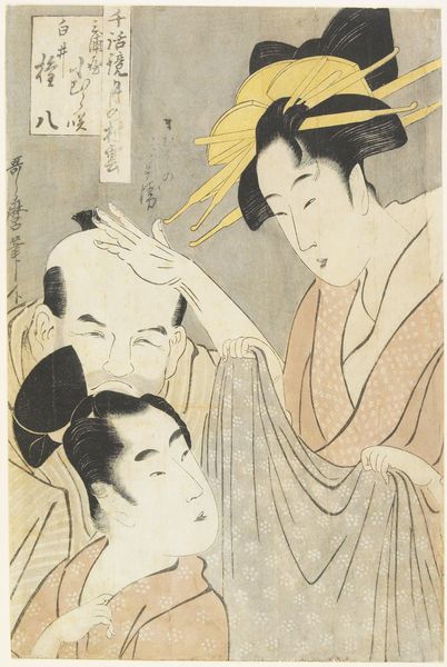 Editor: Here we have Kitagawa Utamaro’s woodblock print, "The Prostitute Agemaki," from around 1798 to 1800. The figures, especially Agemaki, seem almost to float on the paper. How do you see this piece through a more critical lens? Curator: Well, focusing on the materiality, consider the woodblock printing process itself. The labor involved in carving the blocks, the types of inks used, the specific paper selected – these weren't neutral choices. They were deeply entwined with the commercial and social world of Edo period Japan. Ukiyo-e prints like this weren't just art; they were commodities produced and consumed within a specific economic framework. How does recognizing the means of production affect your view? Editor: It definitely shifts my perspective. I hadn’t thought about the process so much, but knowing that it was commercial art makes me think about the intended audience, not just the artistic value. Curator: Exactly! And the depiction of Agemaki, a high-ranking courtesan, is also part of this commodity exchange. Consider how her image was crafted and consumed by a male audience. Think about the societal pressures placed on women involved in this economy, and the implications of reproducing her image. This isn’t just a beautiful print; it's a window into a complex system of labor, value, and representation. Where does the labor of the female body begin and end here? Editor: That makes me consider the whole industry surrounding women like Agemaki, not just her beauty but also the circumstances around her being represented this way, who was able to own that print and control it, almost possessing her. It’s a lot more complex than I originally thought. Curator: Precisely. And Utamaro’s choices—his mastery of line, color, composition—served to enhance the desirability and marketability of his subjects. Understanding the material conditions of its creation unveils this print's complex social reality. Editor: Seeing how the production process and social context intertwine has really changed how I view Ukiyo-e. Thank you.