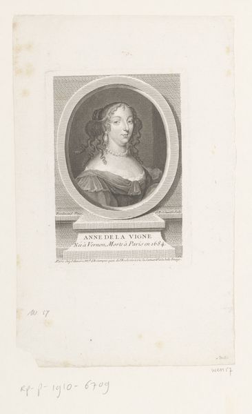 Curator: What a striking portrait. This is "Portret van Marie Angélique de Scorailles", an engraving by Étienne Ficquet, dating back to 1755. It resides here at the Rijksmuseum. Editor: There's a certain coolness to it, wouldn't you say? An almost calculated elegance. The sharp lines and controlled shading feel very deliberate, very… staged. Curator: The technical skill is undeniable. The fine lines of the engraving capture the details of her lace collar and the voluminous curls of her hair with precision. Consider the symmetry of the oval frame, elegantly balanced upon the inscription panel below. Editor: And Marie Angélique herself? A woman defined by her position, frozen in time. This portrait says less about her as a person, and more about her status in the French court, one that demands a reading through the lens of gender and power dynamics. Curator: The Baroque influence is evident in the ornamentation and attention to detail. It conforms to the conventions of portraiture from the period—an emphasis on representing the sitter with grace and refinement. Editor: Right, but we have to remember who Marie Angélique was, and in relation to who! As mistress to Louis XIV, her image became a political tool. Reproducing this print meant to keep her presence alive. The idealisation is a strategic manoeuvre. It’s not simply about aesthetics. Curator: Indeed, by employing an established visual language, Ficquet reinforced a system of visual representation tied to those aristocratic values and aesthetic sensibilities. It speaks to the perpetuation of an image that met societal expectations. Editor: Ultimately, these works act as mirrors reflecting power structures. By analysing them, we uncover and question who has been historically allowed—and who continues to be allowed—to speak and be seen, and how. It's in those power dynamics that the real meaning of an artwork can be understood. Curator: Quite, quite. Viewing this portrait with contemporary eyes allows us to see not just the image itself, but the mechanisms and social scripts it embodies. Editor: Precisely. The artwork, viewed through its social and historical context, truly comes alive.