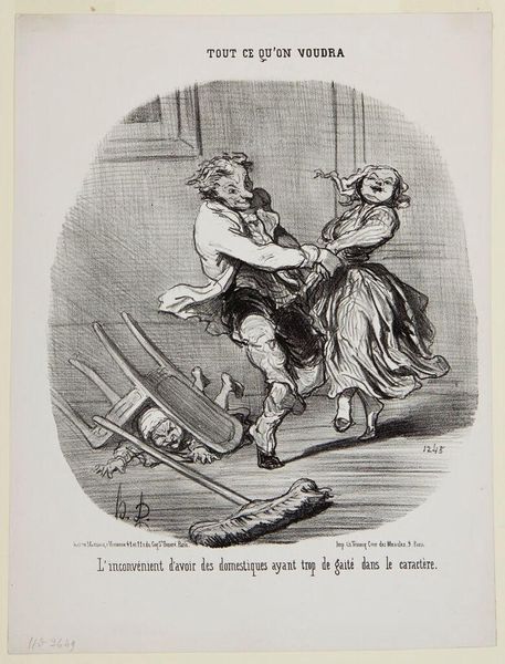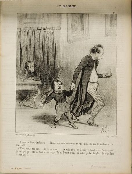 Curator: Honoré Daumier's lithograph, "Let's go, Daddy...again...thirty-two turns..." captures a domestic scene, seemingly ordinary but ripe for interpretation. Editor: The father’s expression, caught between exasperation and affection, really speaks to me. It’s a relatable weariness. Curator: Daumier frequently used his art to critique societal norms and the bourgeoisie, though here, the focus seems to be on the pressures of domestic life and the expectations placed upon fathers. Editor: Exactly. He highlights the tension between public and private spheres, where even the seemingly lighthearted activity of playing with children becomes a site of labor and negotiation, particularly for men. Curator: The fallen hoop on the floor might symbolize the father's failing energy to meet the demands of his children. Editor: I agree. The image reflects on the often-unseen emotional labor within families and how that plays out. Curator: It's a small window into the complex dynamics of family life in 19th-century France. Editor: A poignant reminder of those everyday struggles and joys, resonating even today.