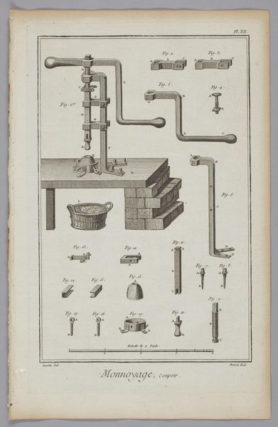 Curator: This print, "Medal and Seal Engraving" by A. J. de Fehrt, presents a fascinating look at the tools and techniques of seal engraving. I'm immediately drawn to how it highlights not just the artistry, but the labor involved. Editor: It’s interesting to see the engravers in the top panel alongside the tools. What does this kind of imagery tell us about the role of artisans in society at the time? Curator: It prompts us to consider how labor and craft were valued, especially within the context of power structures. Seal engravings were often used to authenticate documents and signify authority. How do we view the relationship between craft, labor, and social power today? Editor: That’s a perspective I hadn’t considered. It's more than just technique; it's about the social and political meaning imbued in these objects. Curator: Exactly. Thinking critically about these connections is key to understanding the work.
