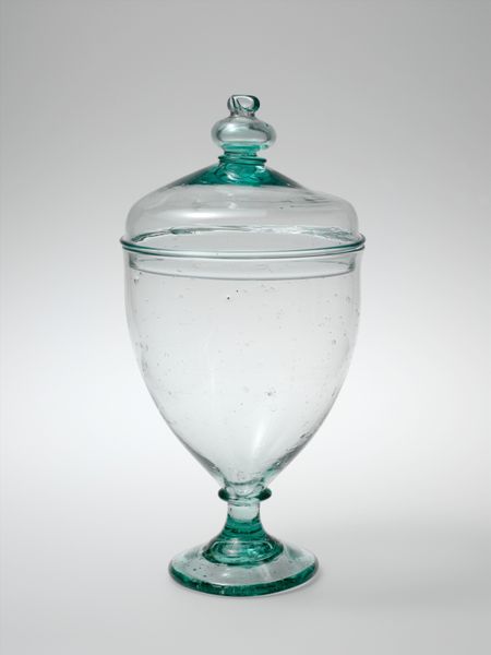 Editor: Here we have an 18th or 19th century glass compote, or sugar bowl, by an anonymous maker. It’s so simple, almost austere, yet that clarity gives it an incredible presence. How should we understand this object? Curator: What strikes me is the transparency, how the piece embodies a certain striving for clarity, both literal and metaphorical. In that period, what did sugar represent to society? Editor: Wealth, I imagine. Sugar was still pretty expensive. A luxury. Curator: Exactly. And the bowl then becomes more than just a container; it's a display of prosperity. The transparency almost demands honesty, or at least, a pretense of it. Do you see any repeated motifs? Editor: The scalloped edge around the base. Those teardrop shapes could almost be interpreted as stylized flower petals. Curator: Think about the historical connotations of the flower. The floriated symbol in this context can carry emotional and even psychological implications – a hint of innocence or even fragility juxtaposed against the bowl's utility. Editor: So, it’s not just about function, but about aspiration. The symbolism elevates everyday objects to carry complex societal messages. Curator: Precisely. Consider this within the broader decorative arts movement; a movement steeped in conveying complex cultural values through visual encoding. Editor: I never thought I could read so much from a simple sugar bowl. It's like peering into another world! Curator: And those echoes of meaning are exactly what keeps these artifacts relevant through time.