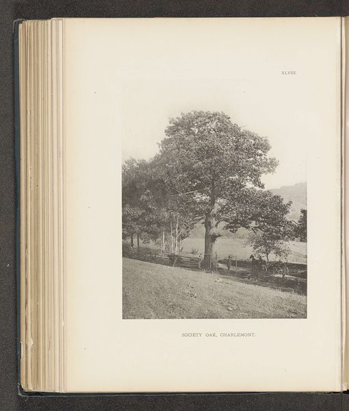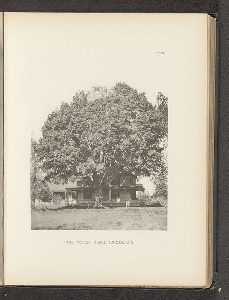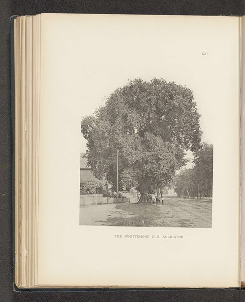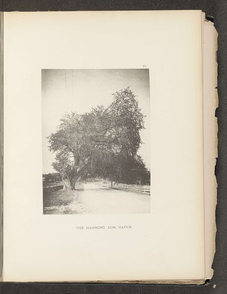 Editor: We are looking at "The Westford Elm," a photograph by Henry Brooks, dating to before 1890. Its monochrome palette gives it an almost dreamlike quality. What catches your eye? Curator: Formally, it is the manipulation of light and shadow that draws my attention. The gradations of tone across the foliage and the road create a sense of depth and volume. Observe how the distribution of light structures the composition. Editor: It seems that the position of the sun allows the contrast to act like a leading line toward the imposing elm. Is there something we should consider about this "Pictorialism" photographic style? Curator: Precisely. The soft focus and the subtle tonal variations indicate an engagement with Pictorialism, a movement that sought to elevate photography to the status of art. The photographer uses techniques such as manipulating the focus, choice of printing papers, and elaborate printing processes to create a visually expressive image, aiming to generate an aesthetic effect over a purely representational record. How does this strategy change your appreciation? Editor: It makes me see how much control Brooks had over the final result and it moves me from thinking that photography is just a "capture." So, the formal composition reveals artistic intent, moving it away from just being a mere reproduction of reality. Curator: Indeed. And we should consider how Brooks uses the very materiality of the photographic process. This type of printing can give warmer or cooler tones, adding to the pictorialist feel. The formal elements underscore artistic intentions and stylistic nuances, moving towards abstraction through aesthetic choices. Editor: Thank you, I'm taking away a whole new way to consider photographic style as a vehicle for something more. Curator: It has been my pleasure to reveal just one reading among countless possible interpretations of form.