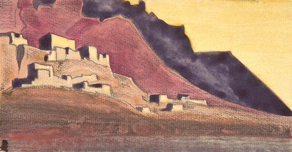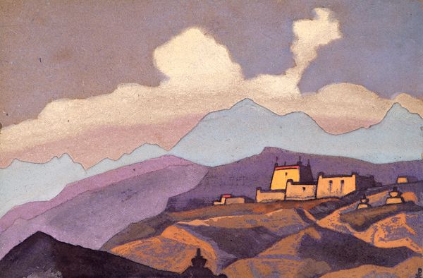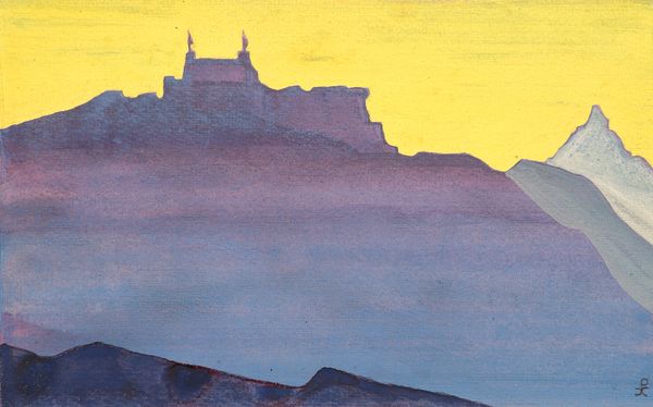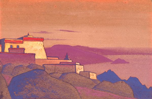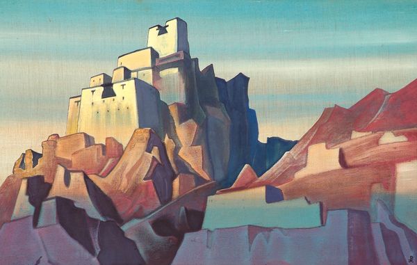 Curator: Nicholas Roerich created "Tibetian fortress" in 1936. The artwork is realized in tempera. Editor: The first impression is dreamy. The colour palette of pinks, blues and browns, it feels both ethereal and grounded. Curator: Roerich’s Orientalist works like this one often carry layers of sociopolitical commentary, don't they? "Tibetian Fortress", painted in 1936, exists at a volatile point in history as anxieties rise surrounding Soviet and Nazi expansion, yet seems indifferent to these looming conflicts. Editor: Absolutely, the way the forms are simplified and almost monumental invites us to consider the sheer weight of history—there’s a certain permanence about the fortress despite the dreamlike, ephemeral quality of the sky. Note the contrast in texture: the sky is smooth and almost featureless, while the mountain and fortress have a rougher, granular quality, probably the result of layering tempera paint. Curator: These fortresses had strategic importance, Roerich captures this silent enduring strength but also considers the cultural identity that intersects with this area during a rise in social consciousness towards Asian marginalization. This period coincides with growing political tensions in Asia and the rise of nationalist sentiments globally. It's also an incredibly violent time for marginalized groups due to an emergence of racist science theories of cultural heriarchy and racial capitalism. Editor: I can see that the artist really leans on simplification in composition to highlight both material and pictorial unity: everything from the brushstrokes to the colour relationships appear unified through what seems like a careful blending of hues and pigment consistencies. Curator: Considering Roerich’s ties to the Theosophical Society, this could be about humanity’s cultural endurance in face of political conflicts. It feels like an open challenge for the viewer to meditate on, especially for those aware of how geopolitics impact cultural expression. Editor: I agree. Ultimately, I think that the harmony between color and form provides an emotional resonance, transcending the boundaries of historical moment to offer contemplation on timelessness and durability. Curator: The artwork really underscores a larger reflection on the cultural dynamics inherent within geopolitics through form, doesn’t it?
