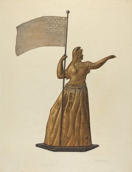 Editor: Here we have Frances Cohen’s “Gilt Weather Vane,” made sometime between 1935 and 1942. It's bronze and metal, and immediately strikes me as overtly patriotic, almost to a point of being unsettling given the historical context. How do you interpret this work? Curator: This piece speaks volumes about the American identity during the pre-war and wartime eras. How do you see its relationship to gender, and what cultural scripts does it seem to be performing? Editor: I suppose the figure does resemble a kind of idealized feminine figure, and she holds the American flag so confidently, maybe representing a sense of national strength. Curator: Exactly. But let's dig deeper. Consider the timeframe. What roles were women being asked to fill in society at this time, and how does that impact the message we are receiving? This isn't simply about national pride, but about mobilizing collective identities, using gendered symbolism to create allegiances and encourage public service through military support and civic participation. How might those commitments interact and create frictions for diverse citizens of this nation? Editor: So, it’s not just a weather vane; it’s a statement about societal expectations, specifically regarding women, within a specific political climate? Curator: Precisely! It raises important questions. Who is included, and who is excluded, from this vision of American identity? Does this figure truly represent all Americans, or does it embody a more exclusive, perhaps even exclusionary, ideal? The work serves as a great conversation starter to ask if anything has changed. Editor: This totally changes my perspective! It's not just a pretty gilded sculpture, but an emblem of complex social and political dynamics. Curator: It certainly is, a historical artifact that can offer unique insight. Thank you for offering up an intriguing and perceptive response, I am intrigued.