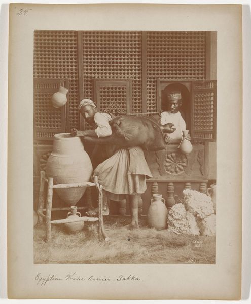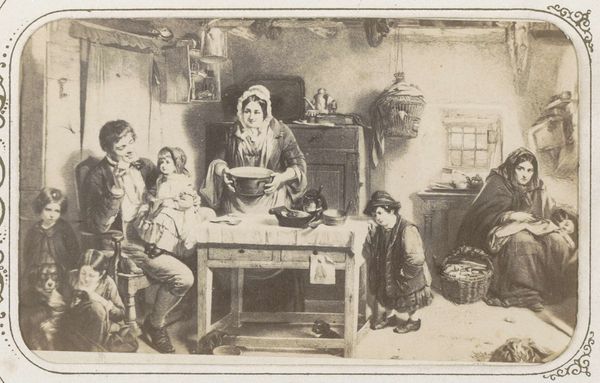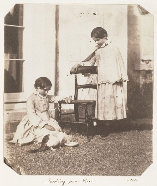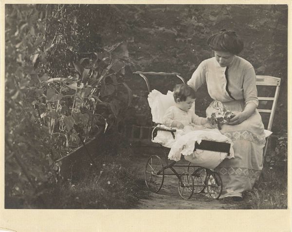 Editor: Here we have a photograph by Waldemar Titzenthaler, possibly from 1918, titled "Marba en Eckart Titzenthaler, kinderen van de fotograaf, met een onbekende jonge vrouw (kindermeisje?) op het dakterras van het woonhuis in de Friedrichstrasse, Berlijn". The children and nanny seem caught in a very intimate moment. What details jump out at you? Curator: It's fascinating to consider the means of production of an image like this in 1918 Berlin. The Pictorialist style attempts to mimic painting through manipulation of the photographic process. We see this family engaging in domestic activities but the construction and material presence of the photo itself points to the photographer’s hand. He’s elevated an everyday scene by imbuing it with the trappings of “art.” Look at the backdrop. What are your thoughts? Editor: The backdrop almost feels like a stage set. I also notice the props: the children’s box, the book near the nanny. They contribute to this staged domestic scene. Curator: Exactly. What is most compelling is how the raw materiality of the photograph – its tones, grain, and even the slight imperfections – speak to the labor involved in its creation. How does this elevation through materiality and artifice affect your perception? Editor: It makes me question the authenticity of the image. Is it a true representation of their lives, or a constructed ideal? Also, knowing it was taken during a period of significant social upheaval in Germany adds another layer. Curator: Precisely. The image becomes a product of its time, reflecting not just a family portrait, but also the complex social and economic realities of a war-torn nation. What new insights about the work do you walk away with? Editor: I see it less as a simple snapshot and more as a crafted object that embodies both artistic intention and social context. I'll certainly look more at materiality and process when assessing photos going forward. Curator: Likewise, analyzing historical photos like these from a materialist perspective reveals them to be products of labor and careful artistic production, and less about a specific truthful instance. Thanks for discussing!