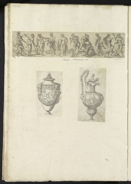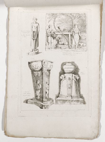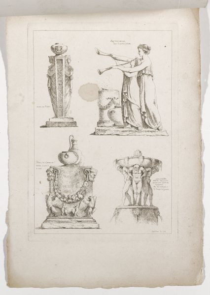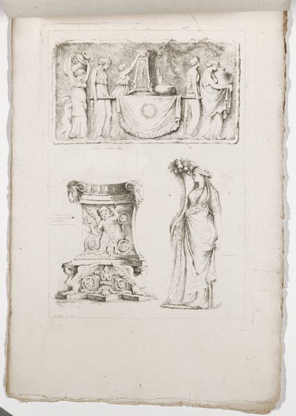 Editor: Here we have "Fascicule III," an etching and engraving from 1763 by Jean Claude Richard, Abbé de Saint-Non, currently held at the Minneapolis Institute of Art. It's an interesting composite of ancient forms, from vases to friezes. What catches your eye when you look at the visual language of this work? Curator: The print immediately draws attention through its diverse range of engraved objects and classical forms. Let’s look closely at the organization; consider how each object relates formally through line, shape, and value, creating an overall structural coherence despite their individual differences. For instance, how does the oval composition featuring three female figures echo the curvature present in the vases? Editor: I see that now! The repetition of those curved lines definitely creates a visual link. So you're focusing on the relationships between the shapes, rather than the subject matter? Curator: Precisely. Note the density of marks creating darker values in some areas and sparse lines in others; these varying tonal fields impact spatial perception. How does this strategic placement of light and dark affect the perceived depth and weight of each object? Editor: The darker areas definitely seem to bring certain forms forward. The urn at the bottom left has so much more detail than, say, the plinth at the lower right, which flattens it. Curator: Yes, and this visual distinction leads to a hierarchical organization on the page, wouldn't you agree? We are directed to analyze the complex structures, textures, and spatial relationships crafted solely through the artistic language of line and form, divorced from historical or symbolic considerations. The interplay, rhythm, and arrangement offer a robust experience in aesthetic observation. Editor: That’s a helpful reminder to consider the impact of something simple like line weight. Thank you for shifting my perspective.