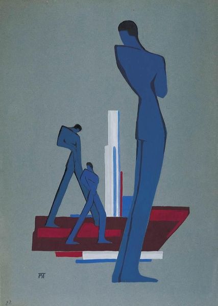 Editor: This is "The Manual Workers and the Intellectuals," painted by János Mattis-Teutsch in 1927, using oil paints. I’m really struck by how geometric and almost architectural it feels. What do you make of the composition? Curator: Formally, the painting is rigidly structured by the juxtaposition of color and line. Note how Mattis-Teutsch uses a vertical division to separate distinct yet mirrored figures or forms. These simplified figures lack individualising details, thereby emphasising abstract representation. How do you interpret this abstraction in terms of meaning? Editor: I guess the artist wants to convey types, or even ideas, rather than actual people. The simplification lends itself to that, I think. Does the color scheme hold significance? Curator: Indeed. The restricted palette - predominantly blues, reds and greens – creates visual harmony, whilst simultaneously emphasising the contrast between the forms. Consider the tension between the rigid blues and the warmer, organic pinks. Does that not create a sense of division? Editor: Absolutely, the blues on the sides are so solid, while the figures in the center look like they are reaching or maybe communicating with each other using those lively, organic colours. Is this dynamic composition representative of anything in particular? Curator: It’s plausible to interpret the painting as an abstract exploration of the relationship between labor and intellect. Observe how the composition mirrors itself while remaining distinct – does that say something about unity through opposition? Mattis-Teutsch's structural and stylistic choices offer insight into his philosophical contemplations. Editor: That’s fascinating, seeing how the pure formal qualities can carry so much meaning about potentially contrasting social roles, but using abstraction in a way to discuss unity. Curator: Precisely. Formal analysis enables a deeper understanding of Mattis-Teutsch's philosophical investigations within this artwork.