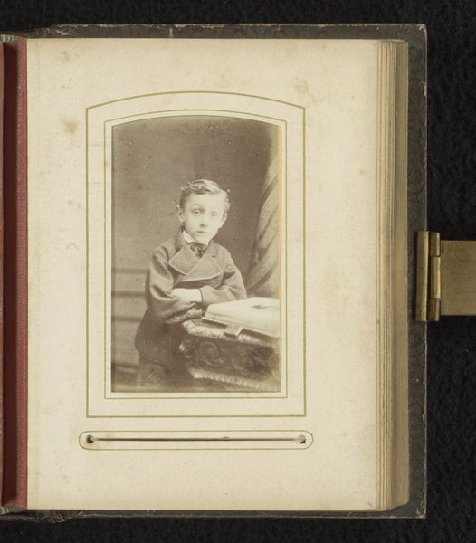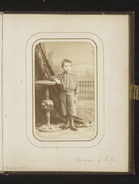 Editor: Here we have a vintage photograph by Louis Sauvager, likely from sometime between 1860 and 1900. It's titled "Portrait of a Standing Boy with a Roll of Paper in his Hand." I'm struck by the boy's formal attire. It makes me wonder about his social class, but the roll of paper adds an intriguing element, making me curious what it represents. What do you see in this image? Curator: I’m immediately drawn to the image's historical context. Consider the era. Photography was relatively new, and portraits like this were often signifiers of status and aspirations. The boy's clothes—almost a uniform—speak volumes about societal expectations for young men of a certain class. Editor: It's like he's being positioned to follow a certain path. Curator: Exactly! The roll of paper is not just a prop; it may symbolize learning, profession, or perhaps even privilege. What does it mean to depict a child like this? Is it merely a family memento, or a deliberate statement about the future the parents envision for their son? Also, let's consider absence. Where are the depictions of children from lower classes during that time? What can it say about representation? Editor: So the photograph isn't just about this one boy, but it can represent the power dynamics of that time? Curator: Precisely! Images like this invite us to reflect on the power structures inherent in portraiture, photography's role in reinforcing those structures, and also about historical power and class representation. How might we use this to understand inequalities of our society today? Editor: I never considered the class aspect so deeply. This photo offers an interesting look into that time. Thanks for the analysis! Curator: My pleasure! Analyzing art with this perspective reveals so much.