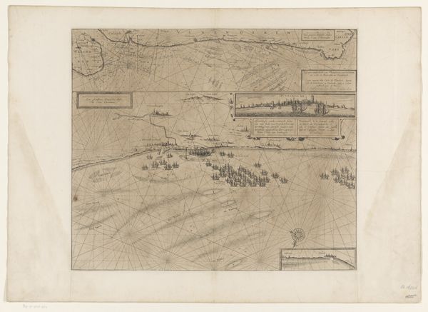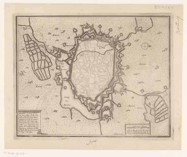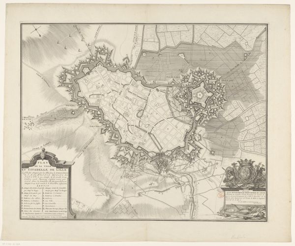 Gerrit Drogenham created this map of Douay in 1710 using etching and engraving. Notice how the composition organizes space through a stark contrast between the structured geometry of the fortified city and the organic sprawl of the surrounding landscape. The dark, precise lines used to depict buildings and fortifications sharply contrast the lighter, more fluid lines of the fields and waterways. This contrast isn't just aesthetic; it reflects a period where urban planning was deeply intertwined with military strategy. The formal layout of the city, with its star-shaped fortifications, speaks to the era’s obsession with control and order. Consider the map as a semiotic system. Each line and symbol acts as a sign, communicating not just geographical data but also power dynamics. The geometric precision of the city challenges our expectations of natural form, imposing a human-made order on the landscape. This tension between the organic and the geometric is a key aspect of how the artwork communicates a sense of power.