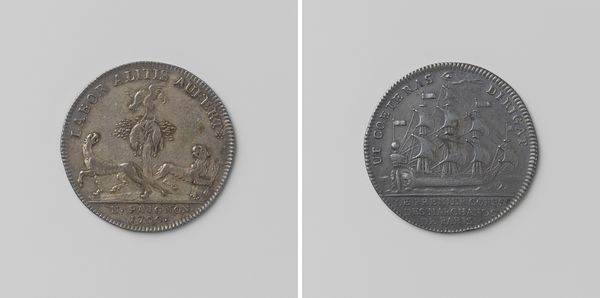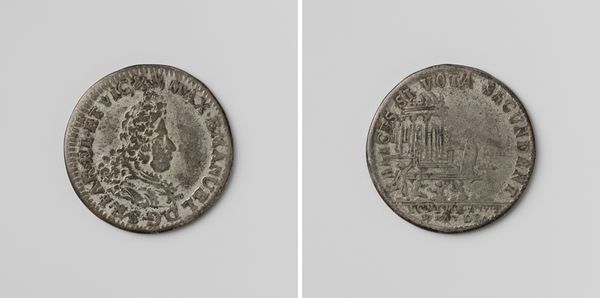 Editor: Here we have a 'Werkhuis te Amsterdam, huismunt ter waarde van tien cent', or "Amsterdam Workshop, House Coin worth ten cents", dating from 1824-1837. It looks like a mixed-media piece, combining print and metalwork – a photograph, perhaps, of an engraving on a coin. What strikes me most is its texture; you can almost feel the age. What do you see in this piece? Curator: Well, it's fascinating how an object like this, seemingly simple, can speak volumes about societal structures. The imagery itself – the shield, the "XXX" which is the symbol of Amsterdam, the declared value – these are deliberate markers intended to project authority and stability. It’s fascinating to consider how even a token reflects civic identity. Editor: That's interesting. I hadn't thought about it in terms of civic identity. So, the symbols, like the Amsterdam coat of arms, were really about communicating a sense of trustworthiness? Curator: Precisely. Currency, even internal currency like this from the "Werkhuis" or workhouse, carries a lot of psychological weight. It represents value, yes, but also a system of exchange and obligation. The choice of these specific symbols reinforces belief in that system. What memories might this coin hold? What stories might it tell about those who used it? Editor: It definitely gives me a new perspective. Seeing it less as just an old coin and more as a symbol loaded with historical and cultural significance… I wonder, what became of the workhouse it came from? Curator: Indeed, its existence prompts such questions. Each element is like a word in a visual sentence, offering us a glimpse into the past. Thank you, this was illuminating. Editor: Yes, it certainly was, thank you! I will remember coins differently now!