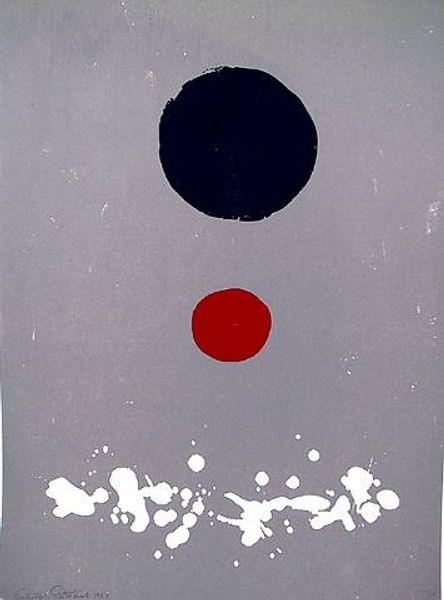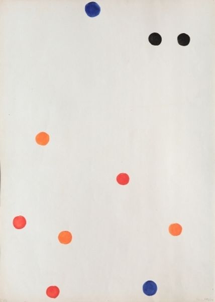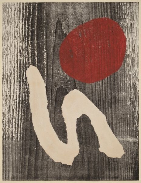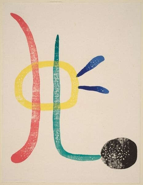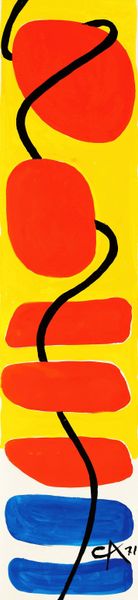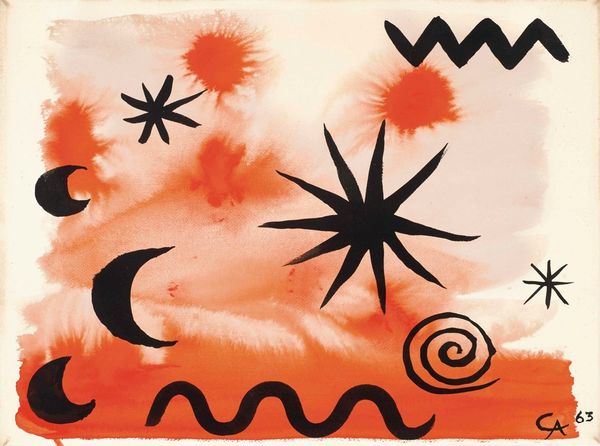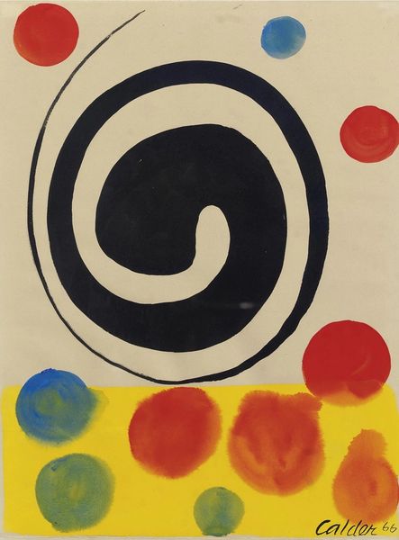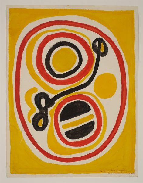 Editor: This is Alexander Calder’s "Red Sun, Red Water" from 1969, done in acrylic paint. There’s something almost playful about the simple shapes and bold colors. What strikes you most about it? Curator: Well, the very *making* of this work, its reliance on acrylic—a material then seen as industrial, not "artistic"—is crucial. Calder's using it questions those rigid hierarchies. This challenges the preciousness often associated with painting. Editor: So, the choice of materials is itself a statement? Curator: Absolutely. Think about the social context too. It's 1969. There is so much happening. Calder bypasses traditional artmaking, choosing accessibility and speed of execution afforded by acrylic. Is he commenting on the mass production and disposability increasingly characterizing the world? How might its resemblance to printed materials factor into its perception of art or craft? Editor: That’s interesting, I hadn’t thought of it like that. The piece seems simple, but it's also part of the pop-art movement that challenged distinctions... Curator: Precisely. The forms, manufactured colors, clean lines... everything screams production. And by literally dating and signing it on the lower right-hand side like a promotional poster, what sort of a comment is he making about originality? What does it tell us that someone trained as a mechanical engineer then moves into a commercial marketplace of art making and sculpture? Editor: It’s really interesting to think about how Calder’s artistic practice reflects those wider societal shifts. It feels very accessible, but also surprisingly thoughtful when you consider the context. Curator: Indeed. By analyzing the materials and the processes surrounding their usage, the work transforms into an interesting commentary about art making itself. It makes one wonder about the materials, means, and modes of production and if they might shape and reflect art's inherent value in some way.