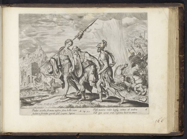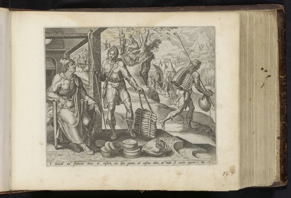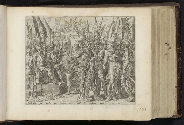 Curator: Here we have an engraving titled “David ontvangt de wapenrusting,” or “David Receives Armor," likely made between 1554 and 1646. The artwork resides here at the Rijksmuseum, created by an anonymous artist. Editor: Immediately striking, the detail in this piece, even at a glance, communicates a potent visual narrative. It evokes a complex intersection of triumph and submission; is it merely celebratory or tinged with oppression? Curator: Look closely at the line work. See how the density of hatching creates form and texture, distinguishing metal from fabric. The artist orchestrates a carefully calibrated symphony of light and shadow, manipulating the contrast to lead the viewer's eye to focal points within the composition. Editor: That dense crosshatching you point out overwhelms; perhaps it symbolizes an entanglement with war? The very act of presenting the armor appears a little forceful; there’s an undercurrent of obligation or power at play. This narrative intersects with modern postcolonial analyses and reflects power imbalances as gifts can bind as well as honor. Curator: The rendering of the figures also warrants attention. The engraver showcases an anatomical correctness typical of the Renaissance while imbuing each person with distinctive characteristics. Notice, especially, how the engraver represents emotional expression through subtle manipulation of facial features and body posture. Editor: The presentation reads not solely as one of celebratory triumph, but instead through the intersectional lens of biblical stories and gendered roles within society. This particular snapshot exposes the transition from shepherd boy to soldier king through material adornment, while emphasizing the masculine attributes associated with regal authority, creating narratives that echo throughout contemporary society. Curator: Absolutely. Consider the organization of this piece, this dynamic interplay between the figures; all converge to direct one's gaze. Note that these converging sight lines highlight and bring David into sharp focus, demonstrating a masterful grasp of spatial organization, achieving balanced contrast despite employing restricted achromatic resources. Editor: I concur. As for closure, my viewpoint emphasizes its contemporary resonances as the image serves less as an immutable artifact, and more as a vital conversation. Its existence calls one to ponder history’s influence. Curator: Indeed; appreciating that history hinges on engaging with this artwork's structure is what matters most, finally demonstrating how thoughtful organization leads all minds forward to contemplate form meeting content within narrative visualization!