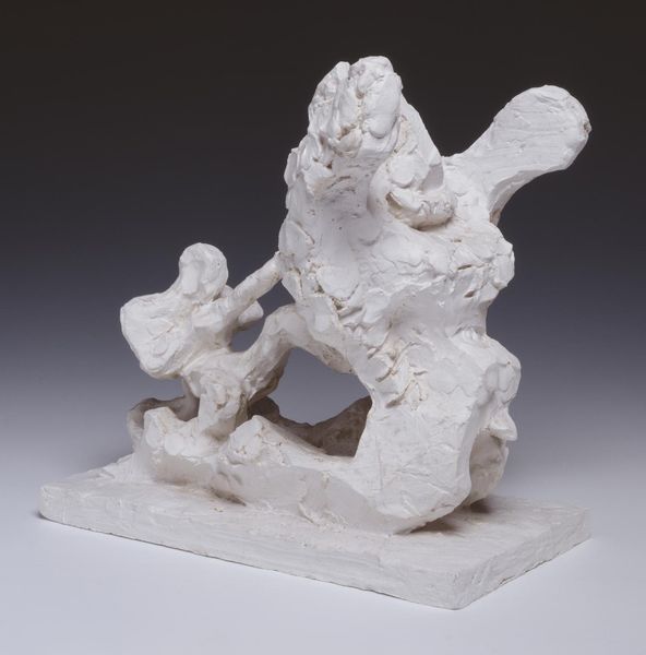 Editor: This is "Jacob and the Angel," a plaster sculpture by Jacques Lipchitz. The forms seem to be intertwined, locked in a struggle. What do you see in the tension between these figures? Curator: The dynamism resides in the interplay of positive and negative space. Notice how the figures’ limbs create openings, voids that are as crucial as the solid forms in conveying the wrestling match. The rough texture of the plaster enhances this feeling of raw energy. Editor: So, the lack of smooth surfaces contributes to the sense of conflict? Curator: Precisely. The sculpture invites us to consider the formal relationships as symbolic. It is through those forms that Lipchitz communicates the essence of the biblical struggle. Editor: I see, it’s a battle articulated in form, not just narrative.