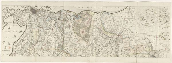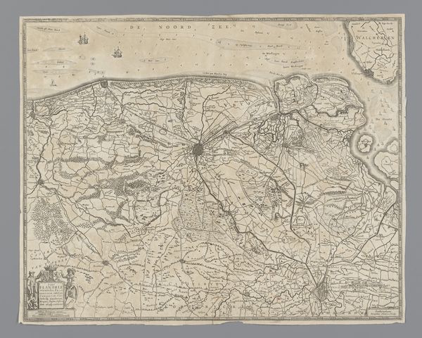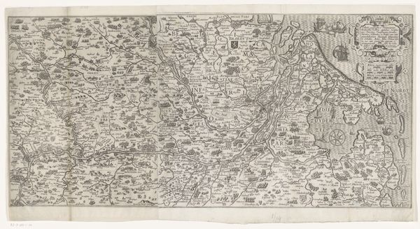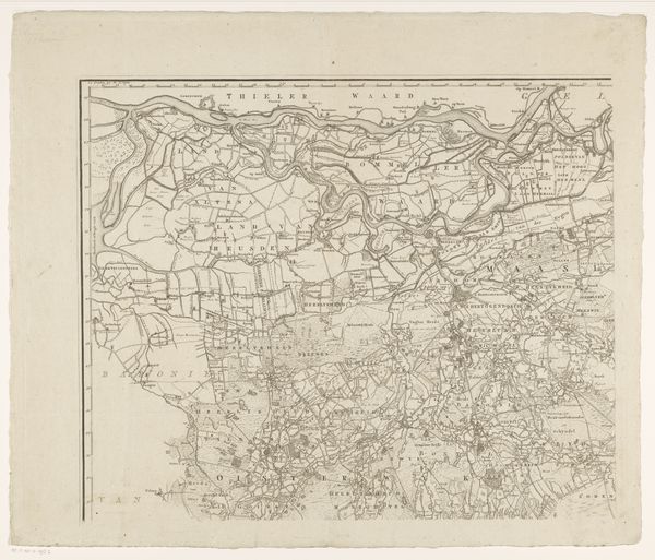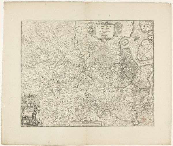 Curator: Here we have an intriguing graphic from the Dutch Golden Age, dating roughly from 1672 to 1706. It's a print titled "Kaart van de Nederlanden met de oorlogssituatie van 1672-73"—or, "Map of the Netherlands with the war situation of 1672-73." Editor: My immediate sense is of meticulously organized chaos. The density of detail, all those swirling lines representing land and water, conveys a feeling of being overwhelmed by information—as if you’re right in the middle of it all, a state of conflict, which probably parallels what many felt back then. Curator: The artist, whose name is unfortunately lost to history, employed the technique of engraving to depict this landscape. Look at the confident strokes used to delineate borders, both geographical and political. Note also the geometric precision in how bodies of water are rendered, contrasted by a more impressionistic take on landmasses. Editor: Yes, and those political borders are absolutely critical, literally defining territories during a period of intense struggle. It’s hard to separate the geography from the geopolitics; it is all interconnected here. Think about who this map was intended for, and how it likely informed decision-making processes regarding strategic operations, movement of peoples and resources, trade routes, or alliances between different actors. It reveals the spatial dimension of political relationships. Curator: Exactly, and we shouldn't overlook the cityscape elements scattered across the artwork. They aren’t merely topographical markers, but nodes of economic and political power. Furthermore, their distribution subtly indicates relationships in trade and communication, as much as who occupied those areas. Editor: I find it difficult not to consider this artifact within the broader historical context of Dutch colonialism and maritime power, when maps weren’t merely passive reflections of the world but powerful tools for claiming ownership. I keep thinking of post-colonial cartography: it reclaims indigenous spatial knowledge. Curator: Yes, looking closely we also recognize certain cartographic conventions – lettering sizes that signify urban settlement populations – which gives us another metric by which to evaluate historical trade systems of power, as well as Dutch imperial ambitions during that specific time. Editor: It all comes together, really, making this work far more complex than its rather unassuming initial appearance suggests. It becomes a mirror, then—a way of viewing not just the lay of the land, but how the society was organized along its spatial lines. Curator: Agreed. A fascinating example of cartography as both a science and a subjective rendering of reality, then, revealing strategic concerns as much as geographical features. Editor: Precisely. It prompts us to critically examine power relations in this pivotal period of conflict, demonstrating how something seemingly objective like a map can subtly articulate and propagate certain ideological visions.
