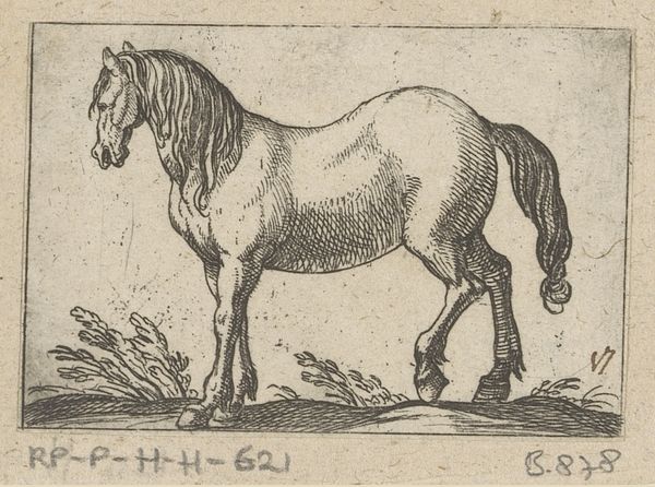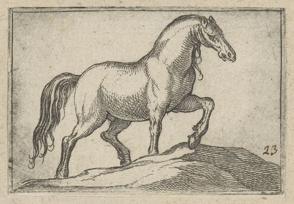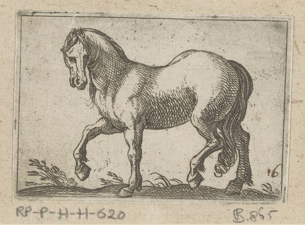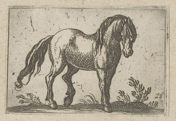 This ‘Standing Horse, Seen from the Rear’ was made by Antonio Tempesta sometime before 1630, using the printmaking technique of etching. Etching, in Tempesta’s time, was becoming increasingly popular. It involves covering a metal plate with a waxy, acid-resistant layer, drawing through this layer to expose the metal, and then bathing the plate in acid. The acid bites into the exposed lines, creating grooves that hold ink. Because it relies on drawing, etching allowed for a freedom of line not possible in older printmaking techniques like engraving, which required more laborious cutting of the metal. This is clear to see in the dynamism and energy of the lines describing the horse’s musculature. Consider, then, that this small print is not just an image, but also an index of a specific type of labor. The etcher’s gestures, translated into ink on paper, make visible a whole world of craft knowledge and technical possibility.