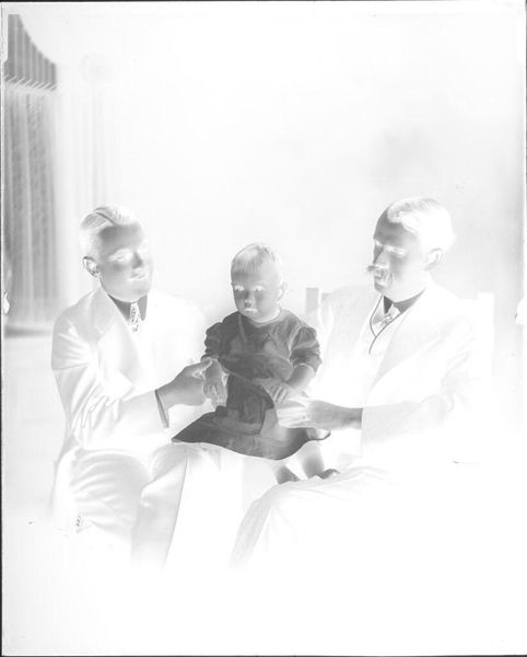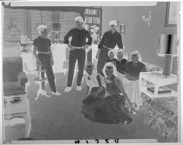 Curator: This is an untitled photograph by Martin Schweig, showing three women watching as one chats on the telephone on a couch in a living room. Editor: It’s intriguing—almost an inverse image, which lends a ghostly, ethereal feel. The women appear frozen, suspended in a moment of rapt attention. Curator: This image reflects the increasing role of women and their social circles in the mid-20th century, with the telephone becoming a pivotal tool for maintaining those connections. Editor: Absolutely. The telephone cord, a visual umbilical, links the woman to a world beyond the room. It suggests power and influence, doesn't it? Curator: I agree. The presence of an audience suggests the importance of these conversations within their social structure. Editor: Definitely. The gazes of the other women are so focused. You can almost imagine the secrets and social dynamics at play. Curator: It highlights the subtle, but significant, ways technologies like the telephone shaped domestic life and women’s place within it. Editor: A fascinating glimpse into mid-century social rituals, charged with feminine energy.