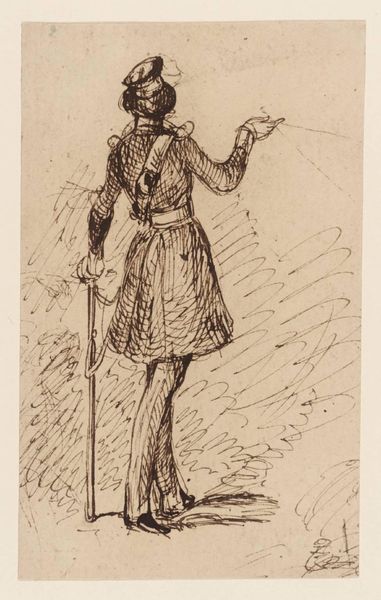 Editor: So this etching and print, created by F. Hendriksen between 1847 and 1938, is titled "Dommer vind Blitz." I'm struck by the figure’s slightly theatrical pose and clothing. What kind of commentary might Hendriksen be making through this portrait? Curator: The artist probably operated in specific cultural milieu. To really understand the piece, we need to unpack how it operated in the socio-political landscape of its time. Who was Hendriksen's target audience and how would they interpret this figure, especially considering the title's suggestion of "judgment" and "lightning"? Editor: That makes me wonder about the significance of the pipe and the rather formal, almost judicial-looking, coat. Does this suggest something about authority? Curator: Possibly. It’s more crucial to understand how symbols like the pipe or attire function in broader societal discourses. Were there specific power structures or figures the artist was perhaps critiquing? Was Hendriksen himself part of the establishment, or was he an outsider looking in? Answering these types of questions grounds the art in the time of production, revealing meaning for contemporaries and possibly meaning lost to modern audiences. Editor: So it’s not just about what the artist intended, but also how the work actively engaged with its viewers back then. Curator: Precisely. The reception is everything. Think of museums now too. How does the curatorial process and display shape current understanding? Every stage impacts the meaning. Editor: I hadn't considered how much context matters. This makes me want to delve into the political climate of the time and any satirical publications that might shed more light on its intent. Curator: A perfect start! Thinking about a piece of art in dialogue with the social currents in its environment is always very worthwhile.