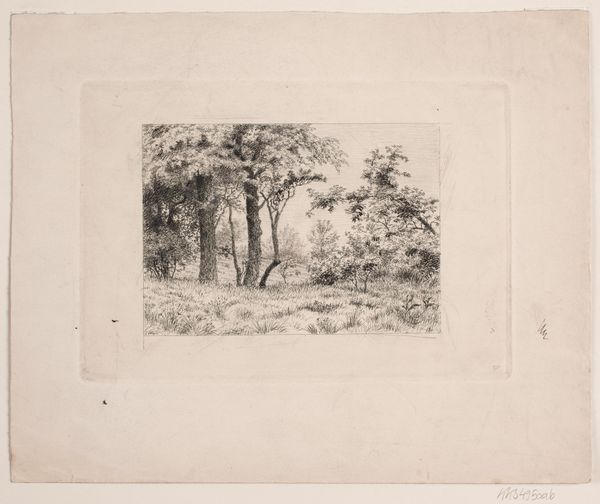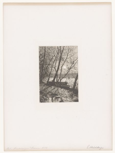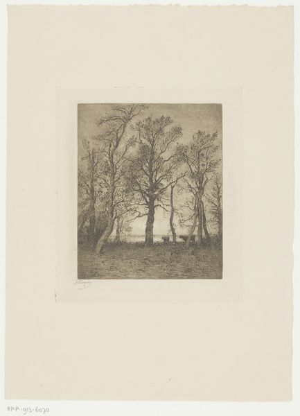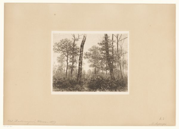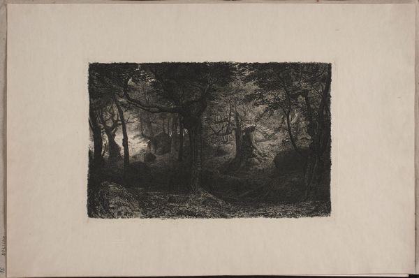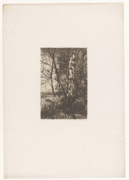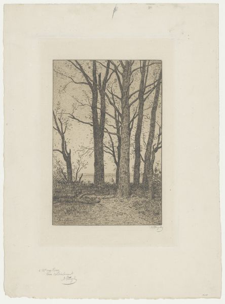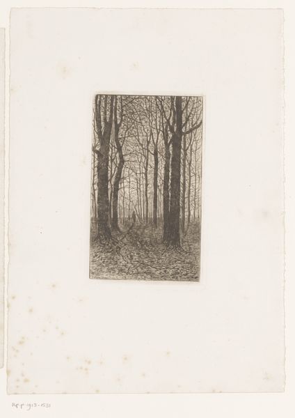 Editor: We're looking at "Wandelaar met zijn hond in het bos" or "Wanderer with his dog in the forest" by Karl Buchholz, an etching made in 1888. The limited palette gives it an austere mood, almost desolate. What strikes you about this work? Curator: What stands out to me is the labor-intensive process of etching used to depict this forest scene. Think about the tools, the acid, the meticulous work required to create this image. Doesn't this method itself become part of the art's meaning? Editor: I see your point! It definitely makes me think about the time and effort involved, and perhaps how that translates into value, or even comments on industrialization. Curator: Precisely. Consider the paper too. Its production is directly linked to deforestation and industrial growth, themes juxtaposed here by depicting a natural landscape. What does the choice of materials communicate to you? Editor: It almost feels contradictory, like nature being captured using methods that also exploit it. The commercial availability of paper and etching must have impacted the accessibility and consumption of art. Curator: Absolutely. This artwork transcends a simple landscape, revealing how its creation reflects the complex interplay of materials, production, and cultural values during that time. Editor: Thinking about the artwork through that lens really makes me appreciate the connection between materials and meaning. Thank you for sharing your insight! Curator: My pleasure! Considering these elements opens a richer understanding.