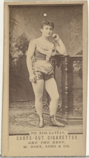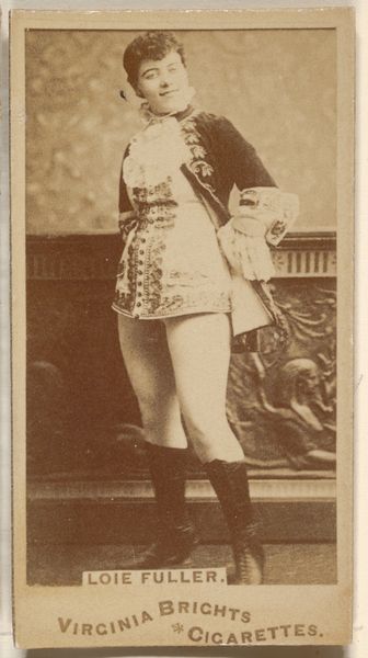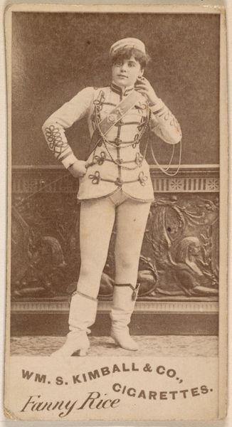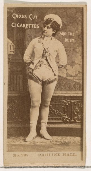 This is a promotional card for Cross Cut Cigarettes featuring Miss Butler, likely made around the turn of the 20th century by W. Duke, Sons & Co. Observe Miss Butler’s attire, a theatrical costume echoing military dress, complete with decorative frogging and short boots. This flamboyant style recalls the attire of stage performers, yet there’s also a hint of authority and command embedded in the uniform. The choice of such garb is no accident. Consider the recurring motif of the 'triumph'— a visual trope found in Renaissance art and beyond, where figures are depicted in commanding poses to convey power and success. Here, the uniform subtly connects Miss Butler to this lineage of triumphal imagery, even if repurposed for commercial ends. The subconscious appeal lies in the associations with victory and control, subtly influencing the consumer's perception of the product. It's a fascinating demonstration of how cultural memory and emotion are woven into the fabric of even the most commercial images.