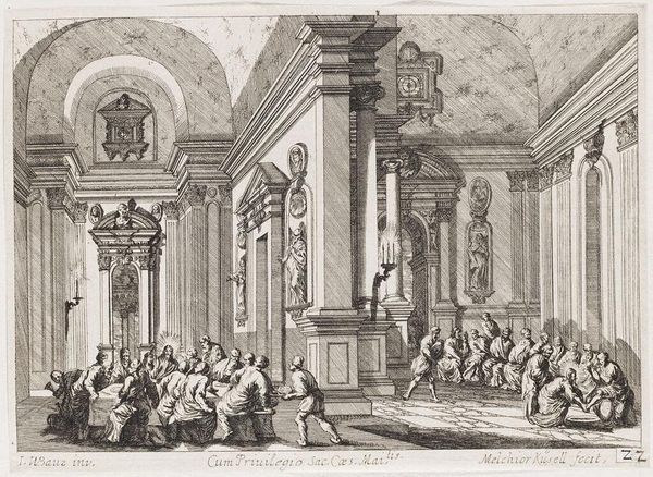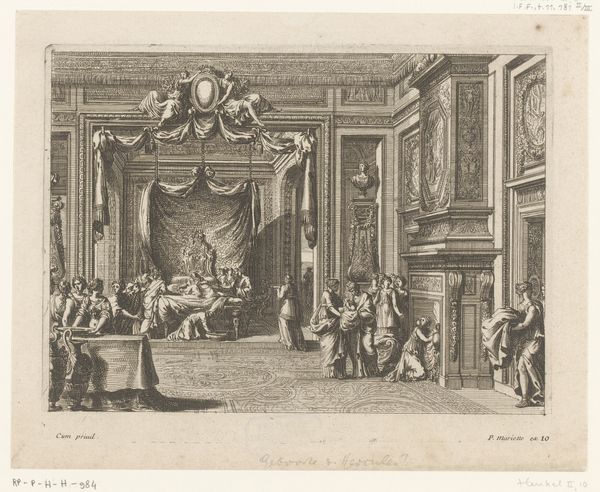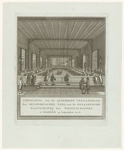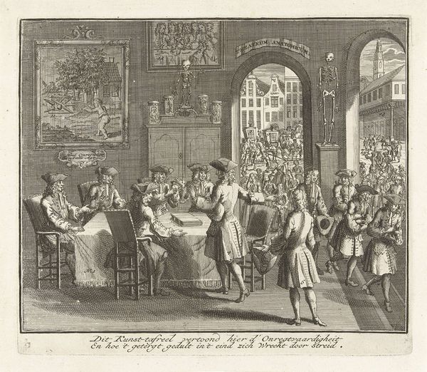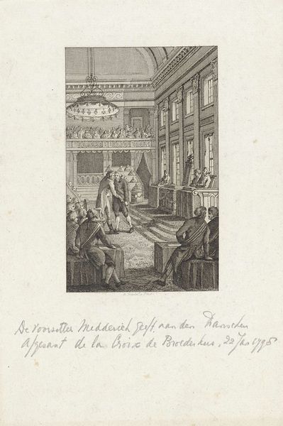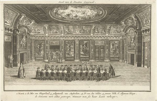 Pieter Hendrik Jonxis made this print in 1786, depicting a feast in Amsterdam. It celebrates the alliance between the Dutch Republic and France. The image shows a grand, formal setting, emphasizing the importance of the alliance. The hall is lavishly decorated with chandeliers and ornate wall panels, pointing to the wealth and power associated with the event. The men are dressed in formal wear, while the use of a balcony suggests a public element to these proceedings. This artwork reflects the complex social and political environment of the Dutch Republic in the late 18th century, when international diplomacy was a matter of both statecraft and public spectacle. A study of period sources might reveal more about the individuals involved and their motivations. By looking into historical archives, we can uncover the layers of meaning embedded in this image.
