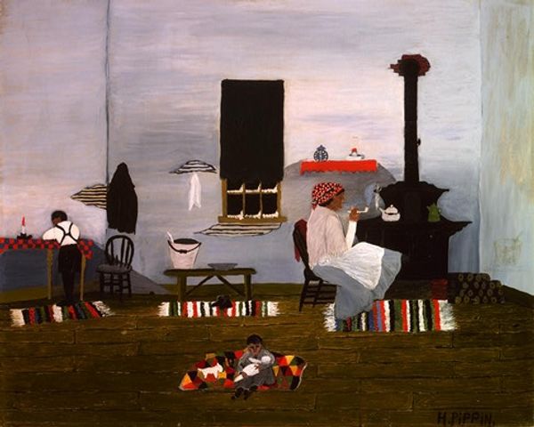 Editor: This is Horace Pippin's "Domino Players," painted in 1943 with oil paint. I find it captivating, mostly because the figures feel so familiar and domestic. What do you see in this piece that speaks to you? Curator: I’m drawn to the recurring motifs within this composition – the subtle yet powerful indicators of community, resilience, and shared experience. What visual cues lead you to interpret the scene as 'domestic?' Is it the warmth of the indoor setting? The game itself? Editor: Probably the game. Dominoes seem so...everyday, and I guess the simple interior adds to that. The window in the background even looks like it has a view outside. Is there more to that game symbolism? Curator: Games, particularly those played communally, are deeply symbolic. They can represent not only leisure and recreation, but also strategy, competition, and social dynamics. What cultural or personal memories does the image evoke for you? How might Pippin, as an African American artist during the 1940s, be using these symbols to comment on larger social narratives? Consider, also, that a window does frame the figures within an interior scene and acts as a liminal space: the inside and outside, known and unknown. Editor: Hmm, so maybe Pippin is suggesting how the simple game carries generations of history. Dominoes aren't just dominoes; they represent community in times of adversity. Am I on the right track? Curator: Precisely. Think about the objects around the players, each loaded with possible meaning. Even the color choices, what do those signify for you? Editor: I guess the overall muted palette evokes the past while the small dashes of bright colors hint at hope for the future. I'm seeing it in a totally different light now! Curator: That's the power of art, isn't it? How a single image can hold so much history and human experience.