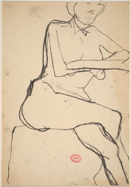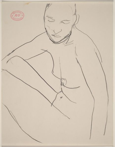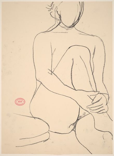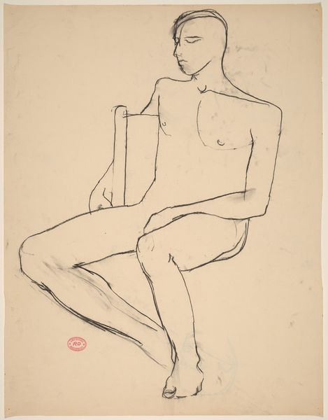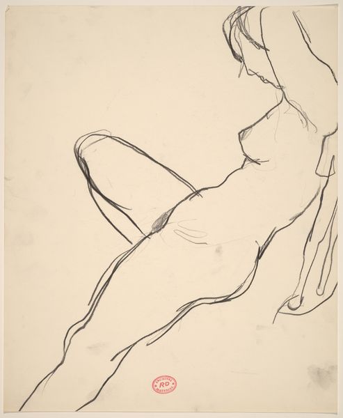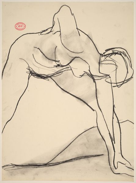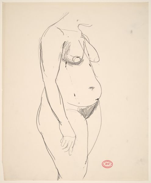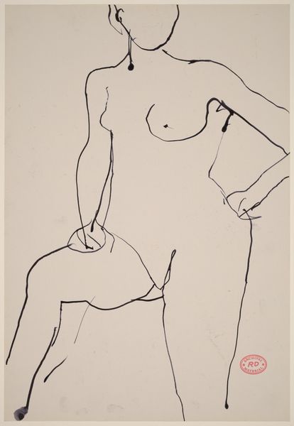 Curator: I am struck by the vulnerability captured in the lines of Richard Diebenkorn’s "Untitled [side view of standing female nude with arm and leg raised]," created between 1955 and 1967 using ink on what appears to be wove paper. Editor: Yes, vulnerable, but there's also a strength there, a defiant curve to the spine. The pose itself seems to challenge you, or at least, acknowledge your gaze directly without flinching. You know? Like she knows she's being watched but decides it's her story anyway. Curator: The reduction to essentials, this almost diagrammatic approach, it pulls the eye directly to the formal qualities. Notice how the economy of line somehow defines volume, implying mass without resorting to shadow or shading. It’s remarkably efficient. Editor: It's more than efficient, it's... knowing. Like, Diebenkorn isn't just showing us a body; he's letting us into a private moment of self-awareness. Or maybe even the anticipation of a dance move. It feels so incredibly poised and light. I imagine I could make the same curve of line, and not get the same… gravity. Curator: Gravity, yes, and yet there is lightness, almost a fleeting quality. It's an interesting duality, this solid form created with such fragile strokes of ink. The figure's inherent groundedness and weight—conveyed using materials possessing no density to speak of! Editor: Exactly! That little lift of the leg... it's a whisper of rebellion against the gravity we just talked about. It's like she is deciding to change the world, starting with her right leg. The way she has placed her left hand and rested on her arm, almost holding her head? I imagine the weight there as very physical, humanizing her a lot, as much as this ink figure lets one. Curator: Well put. To circle back to the structure, observe how the negative space actively contributes to the composition—the angles and planes it forms around the figure help emphasize her own contours. We have to recognize these subtle choices made in an economy of gestures, in order to appreciate the final drawing’s holistic form. Editor: I’ll take your word for it. But even when you step away from the careful deconstruction and look back, it’s as a whole being, solid and, as it seems to me, making the leap to another reality through movement. Like she may just walk right off the paper. A powerful trick, the way line dictates so much movement in space! Curator: A potent demonstration of formalism at its best, in my view. I will certainly revisit this artwork with fresh eyes after our dialogue. Editor: Yes! And for me? I’ll make a mental note that it sometimes doesn’t hurt to see structure alongside the spirit of the artwork.