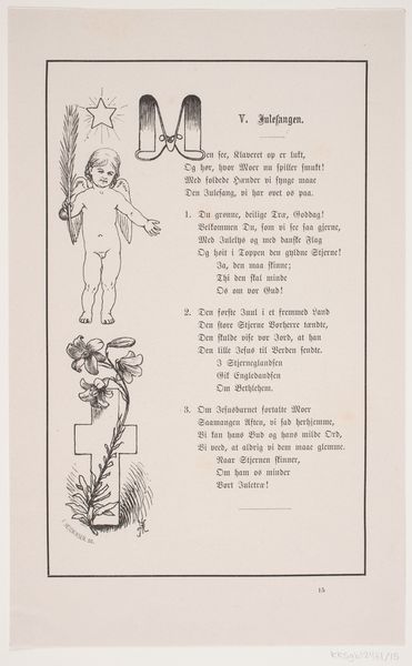 Editor: This is "Illustration til Johan Krohn, 'Peters Jul'" by F. Hendriksen, from 1870. It's a print—an engraving and drawing, I believe—and the style feels almost like a page from a children’s book. I am drawn to the vignettes, little narrative worlds. What strikes you when you look at this piece? Curator: Ah, yes! I'm instantly transported to a whimsical Christmas setting of old. See how the artist has captured the cozy intimacy of preparing for the holiday? Look at the circular window, like a peephole into a bakery, with the birds perched outside, a promise of abundance. It’s a glimpse into childhood wonder, isn't it? Hendriksen is brilliant at creating this charming effect. What do you make of the baker with his chalkboard? Editor: He seems to be showing a number "2". Is he maybe taking stock of the goods he needs to bake? Or showing the current date in December? Curator: Precisely! It speaks volumes, doesn’t it? But to *me*, the number represents not just a count, but the anticipation, the building excitement as Christmas day approaches. See the wheat tied with a pretzel twist too, offering a symbol of celebration and abundance! What feelings does this bring up for you? Editor: Definitely anticipation! It all comes together—the detailed line work, the various scenes, even the slightly old-fashioned text—to create a world that feels both festive and deeply personal. Like a treasured memory. Curator: Beautifully said. Art becomes most powerful when it reminds us of ourselves, I find, when it kindles recognition in the depths of who we are. And these simple festive themes still do the job after over 150 years!
