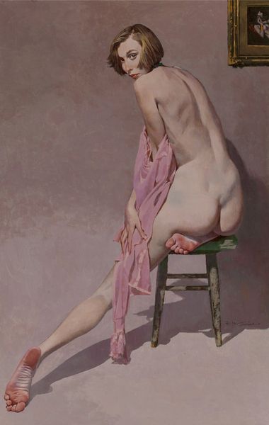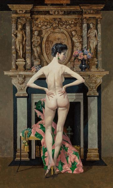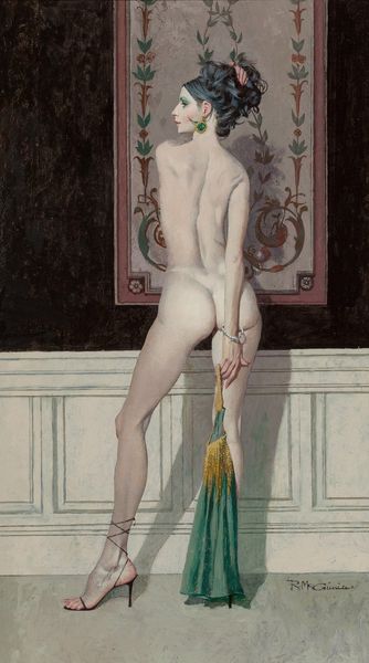 Robert McGinnis created this oil painting titled "The Exhibition," which presents a nude woman standing with her back to us, seemingly absorbed in viewing art within an art gallery. Notice how the woman’s body is rendered with soft, fluid brushstrokes, contrasting with the sharper lines and geometric shapes of the paintings that surround her. The composition guides our gaze between her figure and the artworks, creating a visual dialogue between the observer and the observed. McGinnis subtly blurs the lines between the art and the viewer by showing the woman’s intimate act of viewing art. The viewer's gaze is deliberately directed not at the woman, but towards the artwork. McGinnis prompts us to think about the dynamic interplay between art, the human body, and the act of seeing. This formal arrangement encourages us to explore how our own viewing experiences shape and interpret the work.