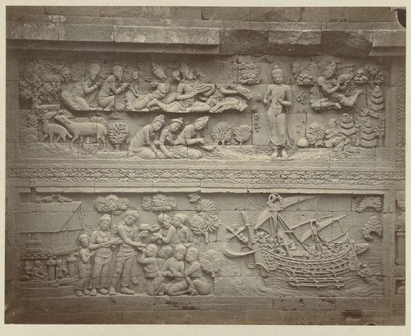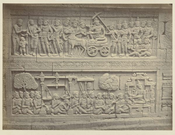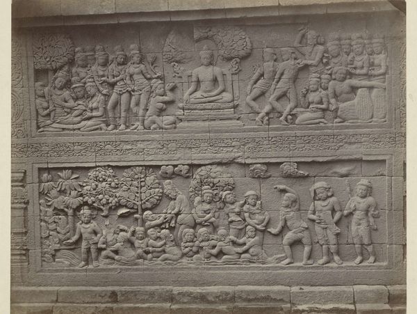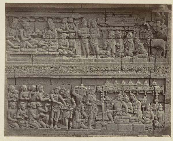 Editor: We’re looking at a photograph by Isidore Kinsbergen, likely taken between 1873 and 1879, capturing a bas-relief on the north side of Borobudur. It’s quite striking; a monochrome image displaying an intricate carving, with narrative scenes unfolding. I’m curious, what strikes you most when you look at this image? Curator: The weight of time, certainly. To see the Borobudur, a monument constructed perhaps 12 centuries ago, filtered through Kinsbergen’s 19th-century lens… it's history observing history, you know? I can almost smell the humidity of Java, feel the sun beating down on the stone. Look closely at the composition, how Kinsbergen frames not just the carvings but the texture of the stone itself. Does it make you wonder about the stories these carvings whisper? Editor: Absolutely. There's a definite contrast between the structured procession at the top and the more intimate, almost domestic scene below. Curator: Exactly. Consider the narrative itself. Are these everyday occurrences or symbolic depictions? Think about Borobudur as a three-dimensional mandala; these carvings served as guides for pilgrims ascending towards enlightenment. Can you imagine the devotion, the hours of labor etched into every line and curve? It’s amazing! Editor: Now that you mention the setting, the stone texture and how it tells a story of history that all starts to come alive. I hadn't really considered the scale, nor the labour involved in crafting this image. Curator: And it makes you think, doesn't it? About impermanence, about the stories we choose to preserve and how we choose to preserve them. Editor: Definitely food for thought, seeing layers of history intertwined in a single image. It changes my perspective. Curator: It's all about seeing, isn’t it? Looking beyond the surface, letting the artwork…well, it gets under your skin, I think.
