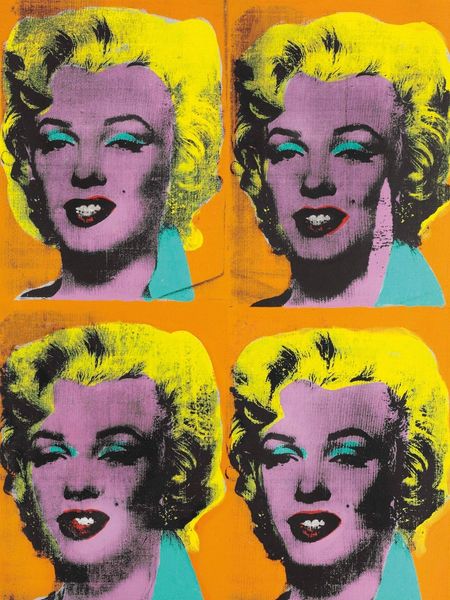 Editor: So here we have Andy Warhol's "Marilyn," made with acrylic paint between 1979 and 1986. The stark contrast makes it feel like a really bold statement, and a little bit eerie. What do you make of it? Curator: It’s fascinating to consider Warhol’s obsession with celebrity and mass production in the context of art history. He's really zeroing in on the public consumption of images. Why do you think he chose Marilyn Monroe as a subject? Editor: I guess because she was such a huge icon at the time, immediately recognizable. Her image was everywhere. So Warhol is commenting on that, right? How celebrity becomes a commodity? Curator: Exactly. Warhol, by reproducing her image, is participating in this process but also critiquing it. Think about the silkscreen technique, how it mirrors the mass media reproduction that created the “Marilyn” phenomenon in the first place. What does the fragmentation, the sometimes garish use of color suggest to you? Editor: I hadn't thought of it that way. Perhaps it signifies the fracturing of her identity, how the media image obscured the real person? Or maybe it shows the fleeting nature of fame itself. Curator: Precisely. It makes us question the authenticity of images and their impact on our culture, doesn't it? Also, think about where this work might be displayed. A museum, of course, elevates its status. Editor: That's true. Presenting this piece in a gallery context definitely changes how we understand the imagery compared to seeing Marilyn on a magazine cover. Thanks, that perspective helps a lot! Curator: Absolutely! Seeing art within its socio-historical context allows for richer interpretations. Hopefully we both now see this ‘Marilyn’ in a different, more meaningful light.
