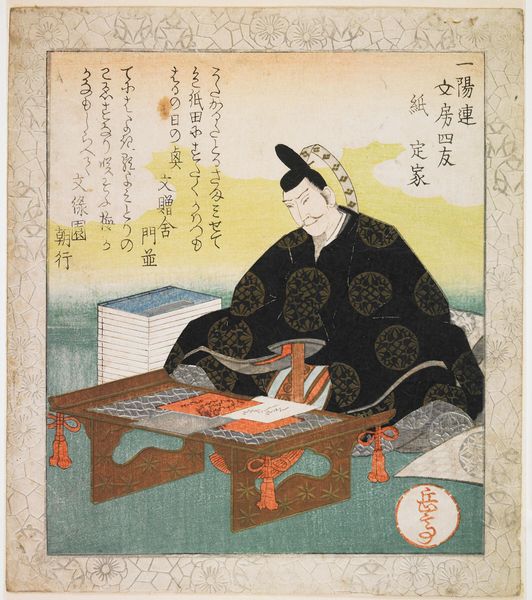 Curator: The subject of this work appears deeply immersed in thought, an almost somber mood. What’s your initial reaction to it? Editor: It certainly has a quiet intensity. I'm immediately struck by the subject's isolation and focus, creating a feeling of introspection that pervades the piece. Curator: That's perceptive. What we're looking at is a print made around 1827 by Yashima Gakutei. It’s titled "Paper: Fujiwara no Sadaie," or Kami: Teika, and is part of a series called "The Four Friends of the Writing Table for the Ichiyo Circle." The medium used is a woodblock print with ink and watercolor on paper. Editor: Ah, so we have a visual meditation on scholarship and creative company. Given it's ukiyo-e, I’m assuming there’s more to unpack about the representation of the scholar. The detail is amazing for a print. Curator: Precisely. In this piece, Sadaie, a noted poet and critic of the Kamakura period, sits poised with brush in hand as if contemplating each character he will paint with intention. Notice the geometric patterns on his robe; those bear social weight. Editor: I find myself drawn to the limited palette and soft gradations in the background, it does speak to the idea of contemplation and reflection, the colors mirror his inward thoughts. Curator: Gakutei masterfully uses symbolism here, linking back to a lineage of revered calligraphers. Editor: The table almost acts as a stage for Sadaie's intellectual drama. Curator: Yes! It underscores the performative nature of scholarship and the creation of culture in its moment. It asks us to consider the past in shaping Japan's contemporary social and creative life. Editor: Knowing all this enriches my appreciation of the work and encourages a deeper investigation of what this scene may be suggesting about its cultural setting. Curator: It offers a beautiful point of entry into understanding the importance of that period for Japan’s culture and art historical movements that came after it.