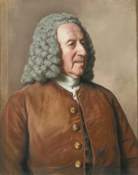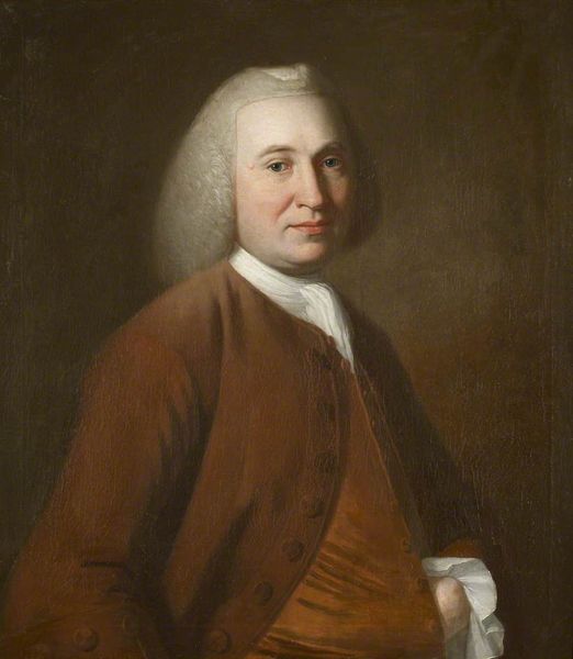 Curator: Oh, there’s something very quietly imposing about this one. Do you feel that? It's George Romney's 1772 oil painting of Abraham Rawlinson. He has such a knowing, almost playful expression. Editor: Playful? I see a man deeply entrenched within systems of power, gazing confidently outwards from his perch atop… well, likely colonial structures of exploitation given the period. The slight upward tilt of the chin reads more like arrogance to me than playful intrigue. Curator: Well, maybe it's the softness, the way the light plays on his face, almost luminous against that dark background. The wig, I'll admit, gives it a sort of performative seriousness, but those eyes… there's something gentle lurking, like a hidden joke only he is privy to. What do you make of the brushwork, so loose in some areas, yet quite defined in others, like in the face? Editor: The brushwork betrays the artifice inherent in portraiture of this era. Romney walks the line, depicting Rawlinson with the expected gravitas of the elite class through pose and composition, but the rendering feels almost too…human? See those rosy cheeks, the creases around the eyes; elements that both soften his features, but speak more subtly to a certain inherent… privilege? Rawlinson wasn’t just born with a silver spoon; the painting reminds me of the human costs embedded into such seemingly quaint, gentlemanly images. Curator: Yes, and yet, isn’t there a danger in reducing him solely to those power dynamics? Couldn’t we also read into this the vulnerabilities of being human? Look, the aging around the eyes is masterfully shown through very fine rendering...I almost think I see, in this image, not an allegorical villain but something close to what's known about his internal states... It feels incredibly moving. Editor: But isn't that empathy perhaps misplaced? A critical lens forces us to engage with these works not simply as character studies, but as cultural artifacts complicit within larger narratives. Ignoring the social context in favor of the individual pathos serves, I feel, only to perpetuate the problem. Curator: Fair, but maybe, just maybe, we can hold both truths, his individual complexities, and his implication within oppressive structures at once. I do find this quite moving. Editor: It’s a necessary tension, certainly. Reflecting on how art, even seemingly simple portraiture, encodes layers of complex historical data allows us to understand not only the aesthetic values, but ethical implications behind these images. Curator: Precisely.