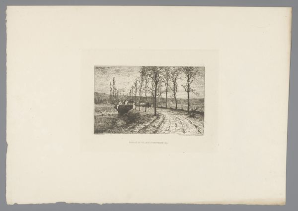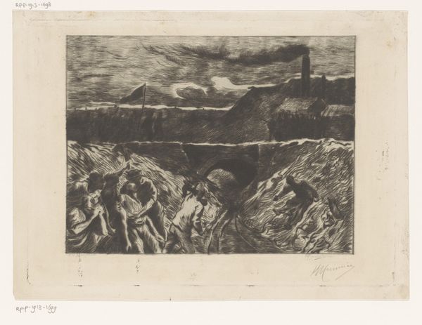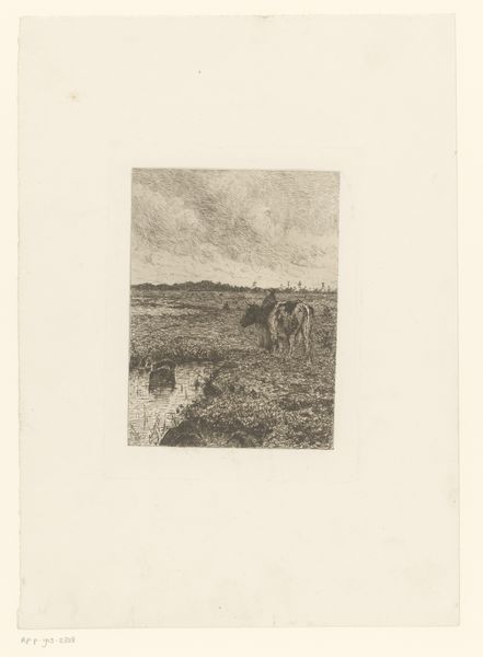 Curator: We’re looking at “Cows in a Meadow with a Milking Farmer,” an etching by Willem de Zwart, created around 1886 or 1887. Editor: Immediately, I'm struck by the interplay of light and shadow; it almost vibrates. There’s a real tension in the composition too, between foreground and distant horizon. Curator: Yes, De Zwart masterfully uses the etching technique to render the textures and light effects. Observe how the cross-hatching varies in density to describe form and depth. The foreground is a flurry of activity while the background fades into the distance with looser strokes. Editor: I’m drawn to think about the laborious process here. Etching requires patience and skilled craftsmanship. The image becomes almost an archive of that physical engagement – the way the copper plate resists or gives way under pressure. Curator: Exactly. There is a dialectical relationship between the artist and the materiality itself. De Zwart is clearly influenced by Impressionism, prioritizing subjective impression over precise representation. We see this in the almost blurry application to the background detail of the houses, creating an interplay of solids and voids that's incredibly sophisticated. Editor: I wonder, though, about the social conditions reflected. Etchings like these, readily reproducible, spoke to an expanding market and interest in rural life, and brought the farmlands and country directly to burgeoning urban communities. The medium here is really tied to social mobility. Curator: An interesting point! Certainly, the dissemination of imagery changed rapidly at this time. However, the beauty lies intrinsically within its structural form, how the landscape and subject are composed. Its delicate formal language creates an idyllic vision removed from industrial progress. Editor: Perhaps, but that idealized view doesn't erase the conditions that make it visible. What price is that “idyll” built upon, in the real lives of those engaged in these rural labors and routines of the farm? I think that is also important to unpack. Curator: You’ve given me food for thought. There are endless paths for interpreting de Zwart's work! Editor: Indeed, it speaks to us on so many levels. I am keen to return for another look very soon.