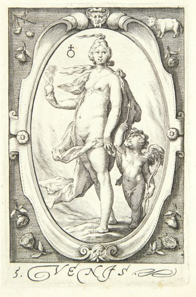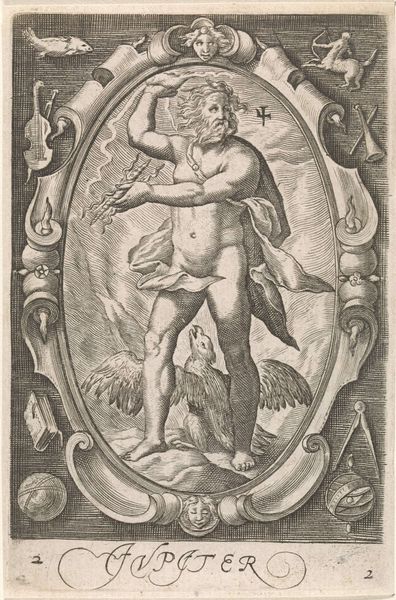 Curator: The piece we're observing is a 1597 engraving titled "Saturnus" by Jacob Matham, housed right here in the Rijksmuseum. Editor: My initial reaction is unease. There's something deeply unsettling about the composition – the sharp lines, the pale figure looming over the child…it feels oppressive. Curator: That feeling is quite apt, considering the context. Matham, a prominent figure in Dutch Mannerism, depicts Saturn, the Roman god of time, often associated with melancholy and constraint. Look closely, and you’ll see him devouring one of his children. Editor: The infanticide is the heart of this allegory, isn’t it? A blatant display of power, a parent crushing potential to maintain control. We can see how those themes resonate through history even today. Curator: Absolutely. It speaks to the cyclical nature of power and the fear of being overthrown. Mythologically, Saturn ate his children because he feared a prophecy that one of them would usurp him. It’s a powerful and brutal image. Editor: And consider the style. Mannerism is characterized by its exaggeration and distortion. Saturn’s body is almost unnaturally muscular, yet his face has a weariness, an emptiness. Curator: Exactly. Mannerist artists deliberately moved away from the realism of the Renaissance to express emotion and convey complex ideas. This engraving showcases Matham's skill in conveying depth and texture. Also, notice the oval frame containing smaller allegorical details that enhance the composition. Editor: It’s a reminder that even within aesthetic movements we now define, individual expression matters. Matham used the tools of Mannerism to deliver a potent, critical message about those who abuse power and suppress future generations. This resonates loudly given so much historical, and continued, oppression. Curator: "Saturnus" is certainly more than just a historical artwork; it's a stark meditation on ambition, dread, and ultimately, the cyclical patterns of authority. Editor: It gives us a framework through art to continue analyzing and challenging power imbalances around us, especially as they repeat themselves through generations.