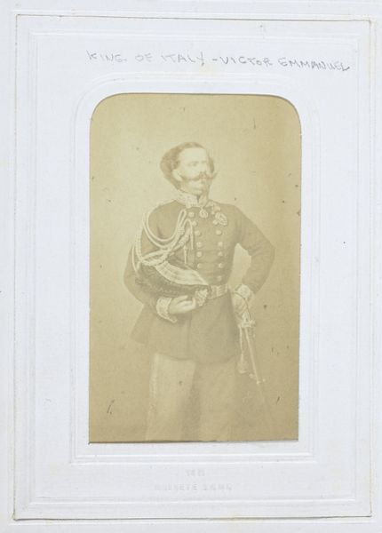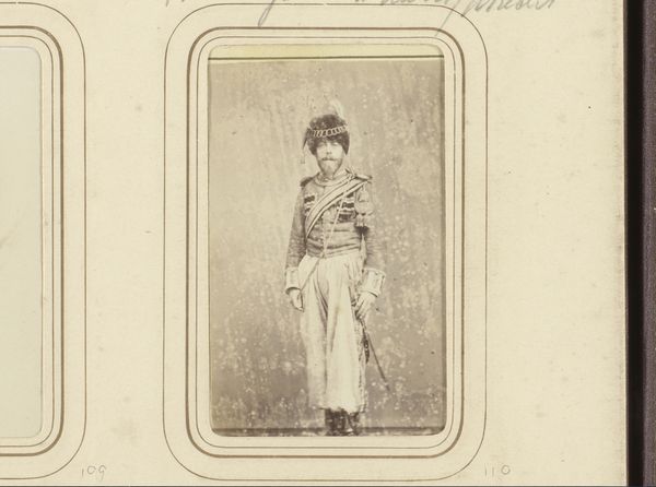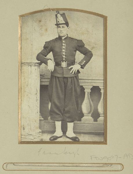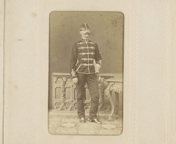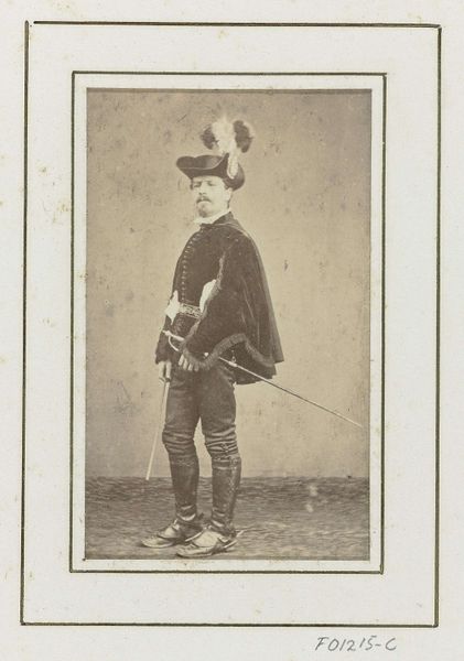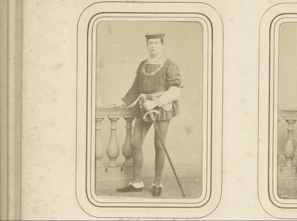 Editor: So, here we have "Portret van een jonge man in kostuum", dating from somewhere between 1865 and 1885, by Henri Pronk. It's a photographic portrait and I'm struck by the sitter's almost theatrical attire and somewhat serious expression. What do you see in this image that really grabs your attention? Curator: You know, I see a romantic yearning, don’t you think? There’s a stillness in the image, like a carefully staged tableau. The subject is probably striking a pose meant to evoke something from literature or stage productions. It’s like they are whispering "I'm a brooding hero." Makes you wonder what play they were headed to, or starring in, eh? Editor: That's interesting. The "brooding hero" thing didn't immediately jump out at me. The historical fashion reads a bit costume-y, though; I think he is wearing a kilt. Curator: Absolutely! It’s theatrical, this "costume-y" feel, but I also find myself wondering what role these photographs played for folks back then. Perhaps these photographs acted like today's "selfies"? A way of presenting oneself as we want to be seen, even if that version is a little… heightened, do you feel me? Editor: I hadn't thought of them as early "selfies", but that's a great way to put it. This piece almost feels like a window into a very carefully constructed performance. Curator: Exactly! And isn’t that just a beautiful bit of melancholy to ponder on a Tuesday afternoon, ah? Editor: Absolutely! Thanks, that's given me a whole new perspective on it. Curator: My pleasure! Glad to stretch the imagination, it is always worth it in my book.