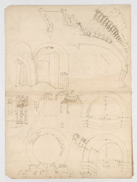 This detailed drawing of the Pantheon's portico, plan, details, and perspective, is made anonymously with pen and brown ink on paper. The drawing, with its brown lines and geometrical forms, projects an exercise in architectural understanding. The sheet meticulously lays out the building's structural elements—from the grand arches and ornate Corinthian capitals to the precise floor plans. The artist employs line as the fundamental tool to dissect and represent the Pantheon, exploring the dialogue between classical ideals and rational design. There's a tension here, between the organic flow of the hand-drawn line and the geometric shapes of the building. This tension perhaps embodies the larger architectural challenge of reconciling human creativity with structural form. We are invited to consider the building not just as a physical space, but as a conceptual framework, where proportion, space, and light converge.