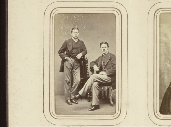 Editor: So, this albumen print from somewhere between 1850 and 1900, titled "Portrait of two young men" by F. Springmeier… It feels so formal and stiff, doesn’t it? What's your take on it? Curator: More than just formality, I see a powerful representation of social expectations and gender performance. What do their clothes signify to you? What does it mean to present themselves in this specific way at this historical moment? Editor: I guess it’s about presenting themselves as respectable, upper-middle class maybe? It's interesting how controlled the image is. Curator: Exactly. Consider the social constraints of the time – the pressure on young men to conform to certain ideals of masculinity, the limited possibilities available to them. How does this image speak to those constraints, or even perhaps, subvert them? Does the gaze, posture, or composition offer space to resist this historical mold? Editor: I hadn’t thought of it like that. Maybe the slightly rebellious leg positioning of the standing man? Curator: Potentially. Perhaps it is less about individual rebellion and more about a shared understanding, maybe even intimacy, forged within those confines. Are they resisting the external gaze? Is it to bolster each other? Photography offered some control over representation, but was also a tool to enforce social order. Who held power here? Editor: That's really interesting! I’m going to have to rethink my initial reaction now. I never thought about all the social commentary and possibilities for expression even within what felt to me like a pretty constrained portrait! Curator: Right! Seeing these photographs within their cultural and historical frameworks opens up really meaningful insights into the lived realities of people whose voices are all too frequently missing in historical narratives. Editor: Absolutely. Thanks for pointing that out to me; I can see so many layers to this photograph now.
