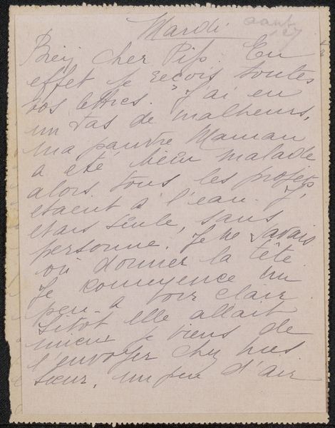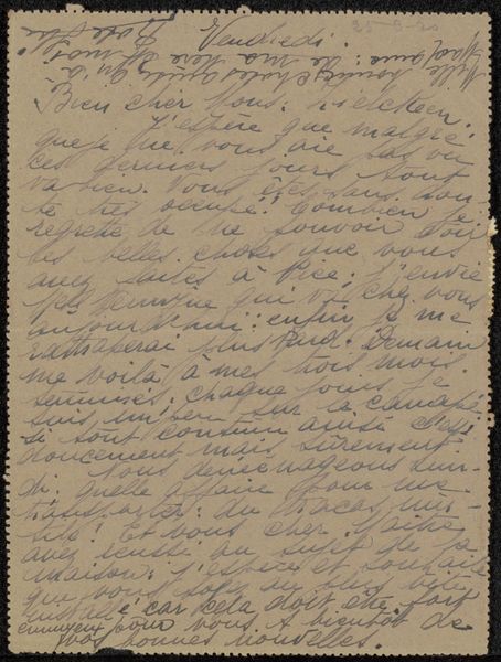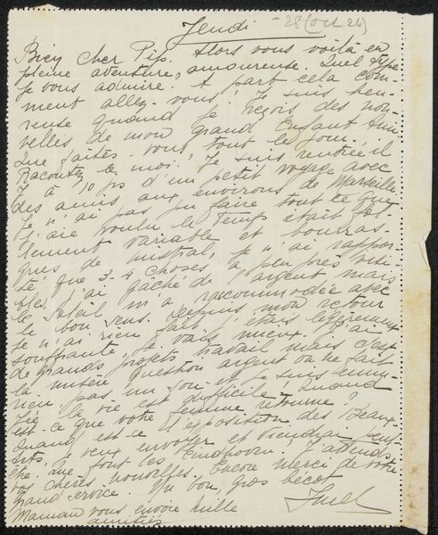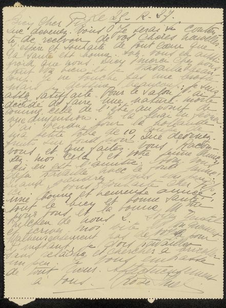 Editor: This is a letter entitled "Brief aan Philip Zilcken" by Rose Imel, sometime before 1923. It looks like ink on paper. It gives an intimate feeling. The flowy cursive almost resembles an abstract design in and of itself. What do you see in this piece, viewed through the lens of its intrinsic qualities? Curator: Precisely. Observe the balance between the density of the script and the open space of the paper, creating a textural contrast. Notice how the ascenders and descenders of the letters generate a rhythm across the page. It is fascinating to look beyond the words. Editor: That is a great way to think of it. It really does transform the writing into almost an art piece of its own. Does the consistency of the ink strokes indicate anything to you about the writing process itself? Curator: It seems very consistent in tone. This implies a focused execution. Further examination of the pressure and line thickness variation might provide insight into the speed and temperament. See how the shapes play with the edges of the format? Editor: I see how those longer letters appear trapped at the margins. Fascinating! I wouldn’t have considered the writing to be part of the structure, almost like a design choice itself. Curator: The integration of form and content here challenges the separation, doesn’t it? It underscores that writing, viewed aesthetically, shares creative DNA with abstract expression. Editor: I see that now. It is a very fresh perspective on a centuries-old approach. I'll consider this from now on. Thank you.